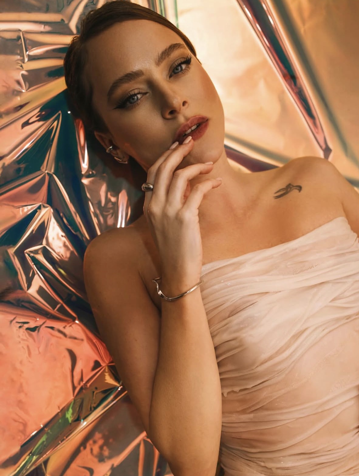Звезда «Холопа-2» пригласила фотографа, стилиста и визажиста, совместными усилиями которых получился уникальный образ. Актриса надела прозрачное «мокрое» платье без бретелей, открывающее зону декольте и татуировку в виде птицы на ключице. Наряд плотно облегал стройную фигуру кинозвезды. Образ завершили аксессуары: серьги, крупный кафф, массивное кольцо и три тонких серебристых браслета. Аглая позировала лёжа и томно смотрела в объектив камеры.