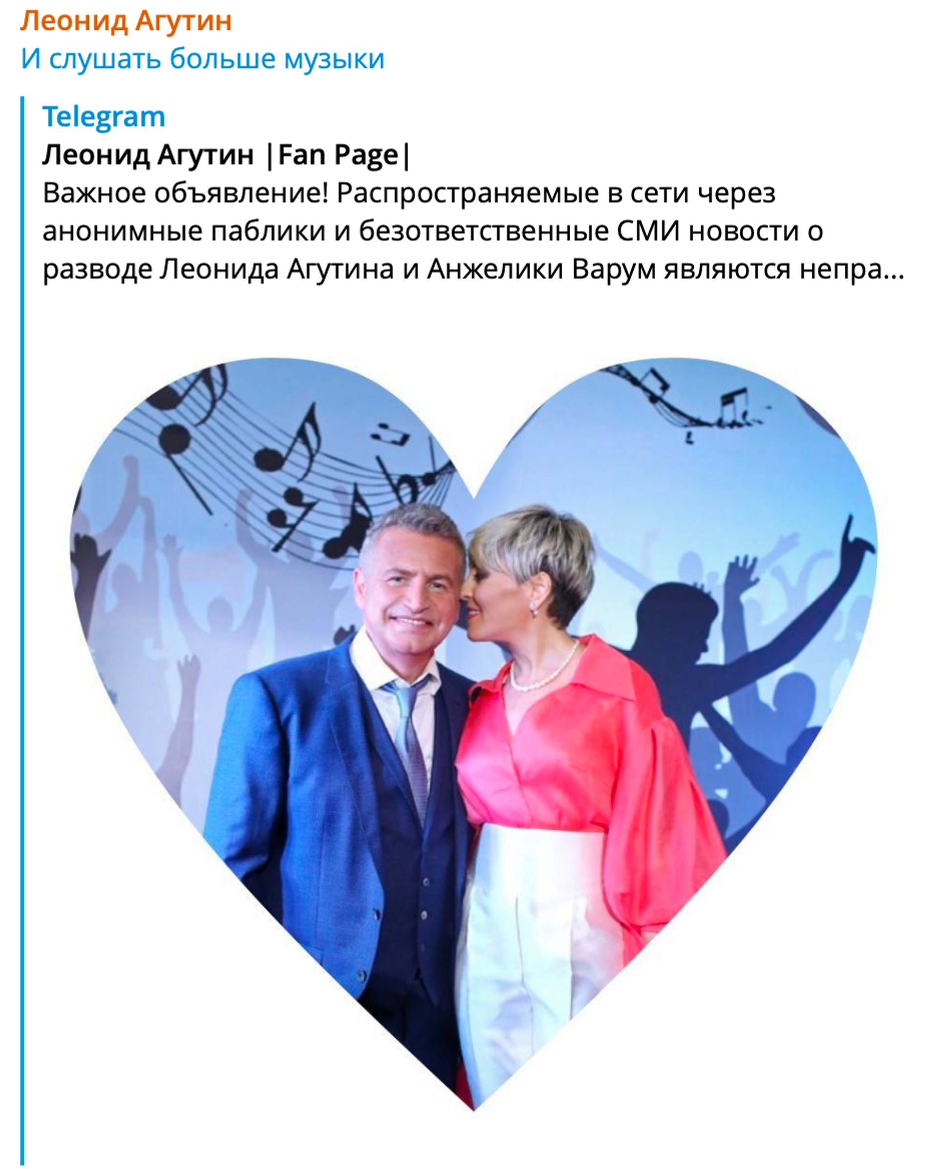 «Важное объявление! Распространяемые в Сети через анонимные паблики и безответственные СМИ новости о разводе Леонида Агутина и Анжелики Варум являются неправдой. В ход пустили и новую песню "Последний трек” группы "3333", которую поддержал Леонид, и фото Анжелики с организатором ее недавнего концерта. Журналисты, даже не обратившиеся к пресс-секретарю артистов, смешали все в кучу и выдают один фейк за другим. Их понять можно: зарабатывать-то надо, а с известным именем в заголовке больше кликов. Невозможно только понять, куда исчезло уважение к собственным читателям. С наступающим всех!» — написано на фан-странице Леонида Агутина в Телеграме. И вас с наступающим! Мы, честно говоря, злым языкам не верили и рады, что все у пары хорошо.