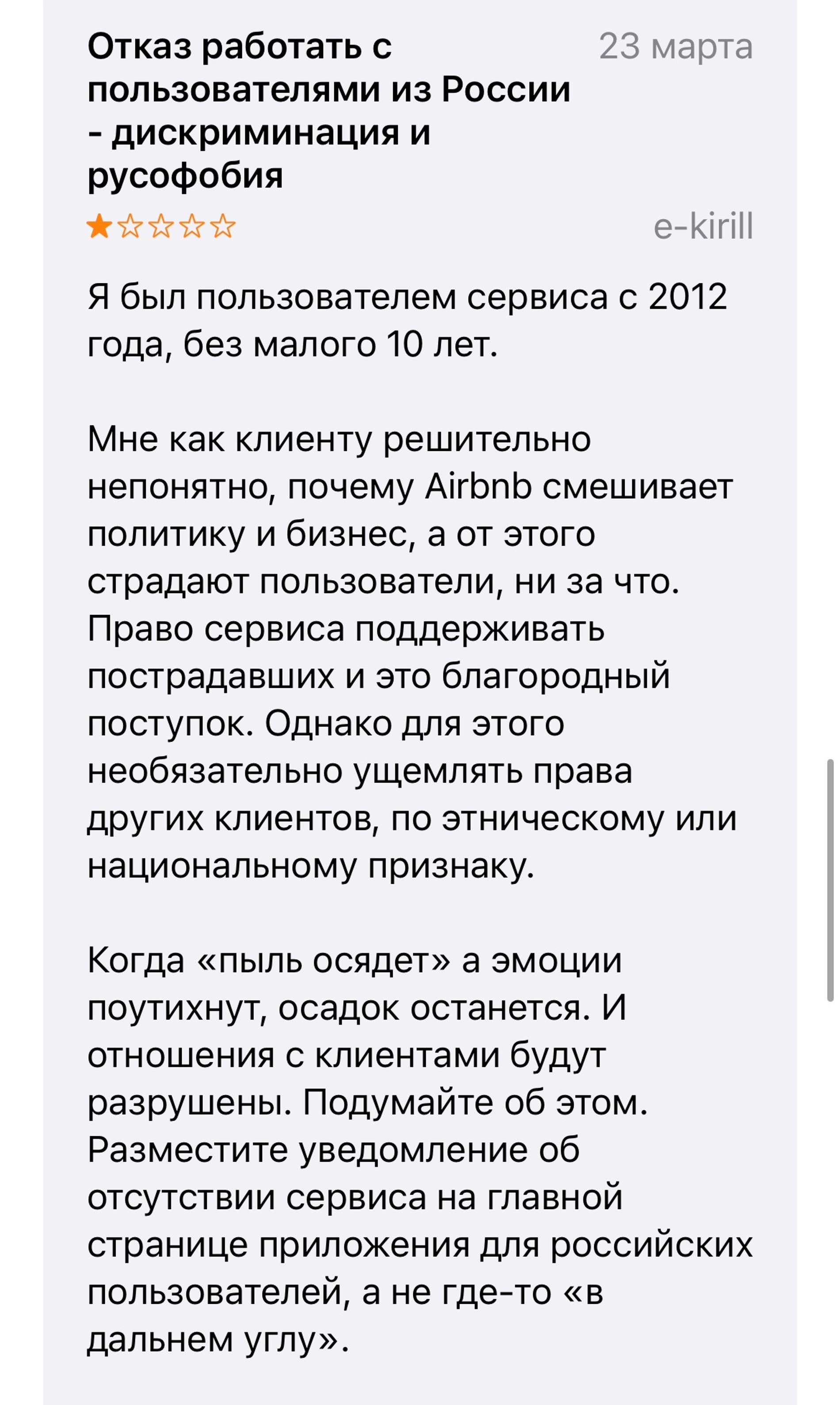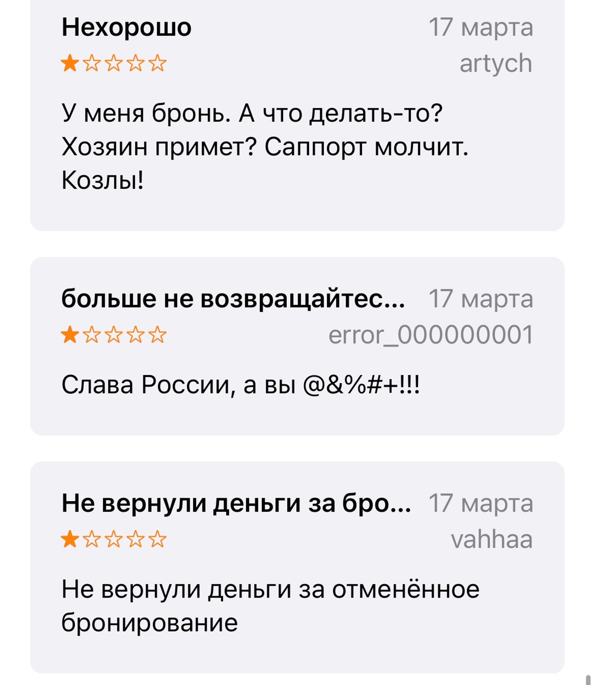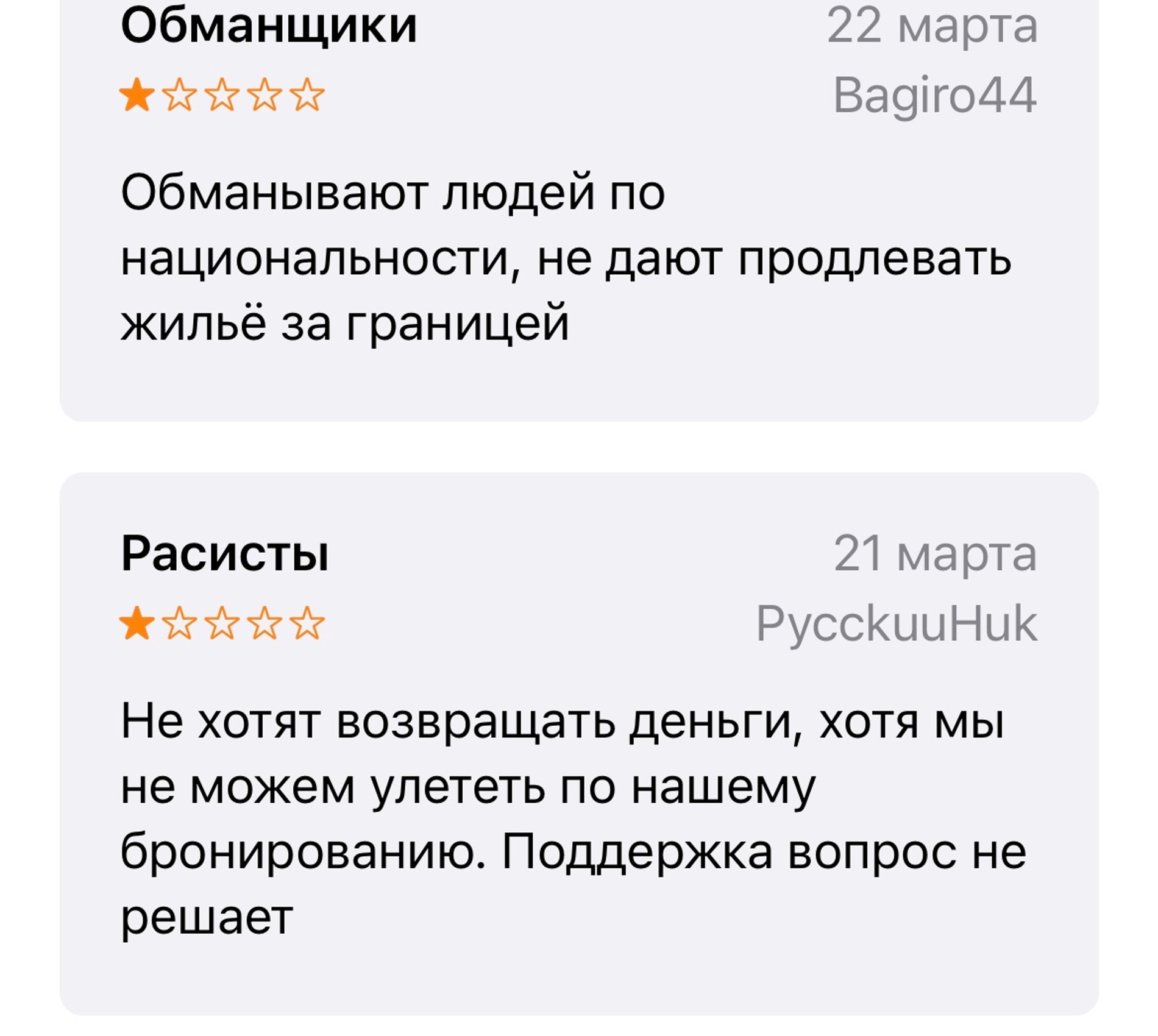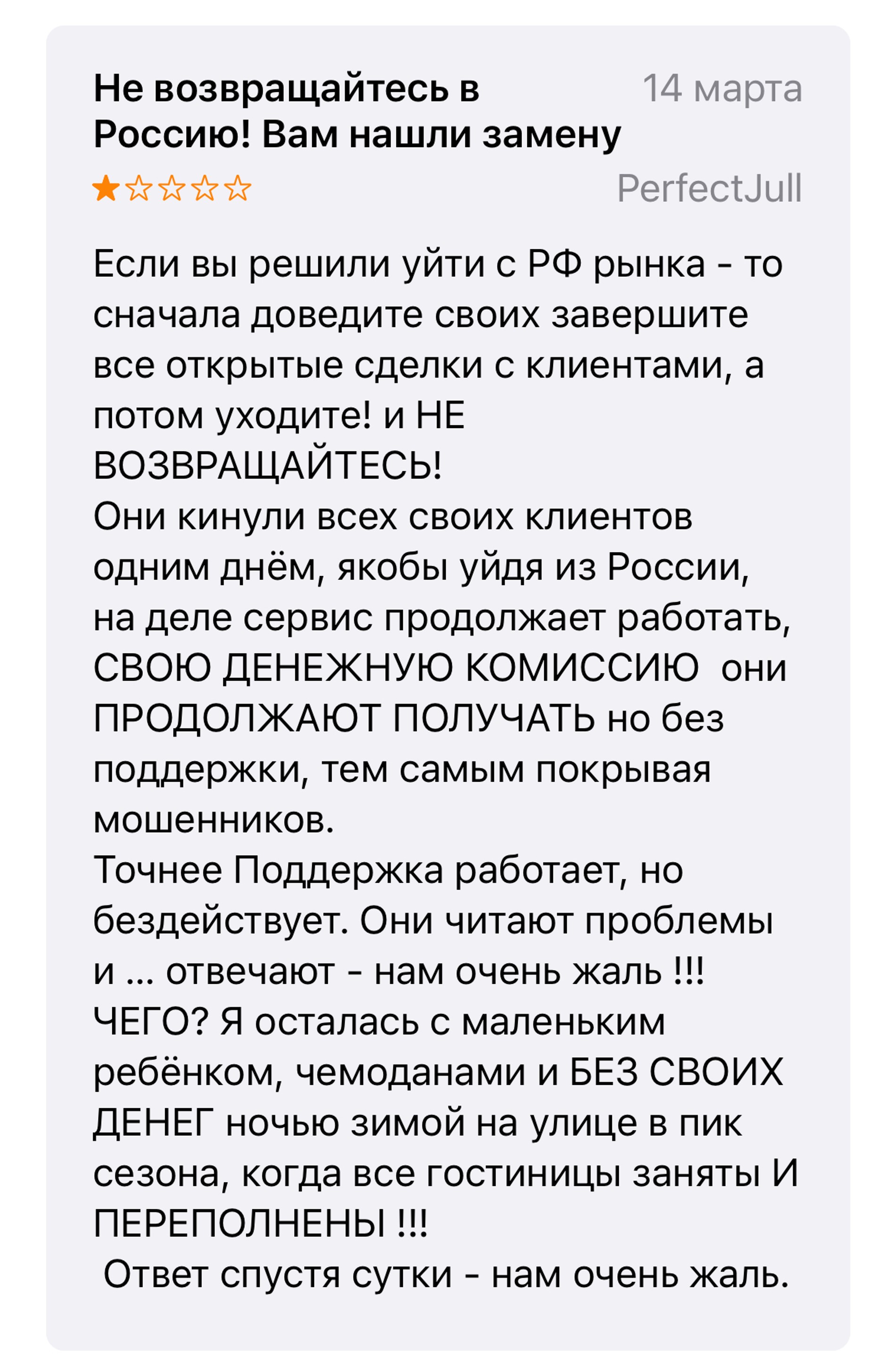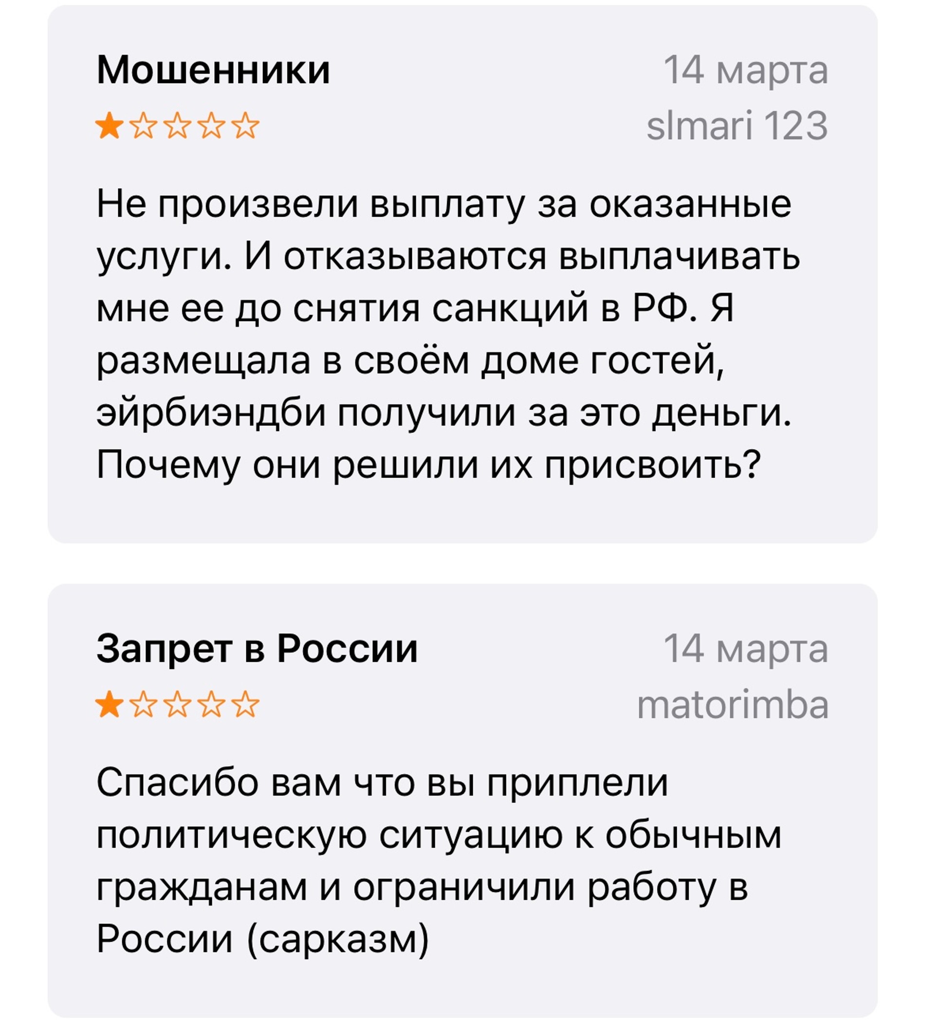 Российские граждане завалили сервис плохими отзывами. Пользователи жалуются на дискриминацию и русофобию, а также сообщают, что им не возвращают деньги за отмененные бронирования и оказанные ранее услуги. Россияне пишут, что поддержка бездействует и на все жалобы отвечает: «Нам очень жаль». Жители России попросили сервис уйти навсегда из страны и больше не возвращаться.