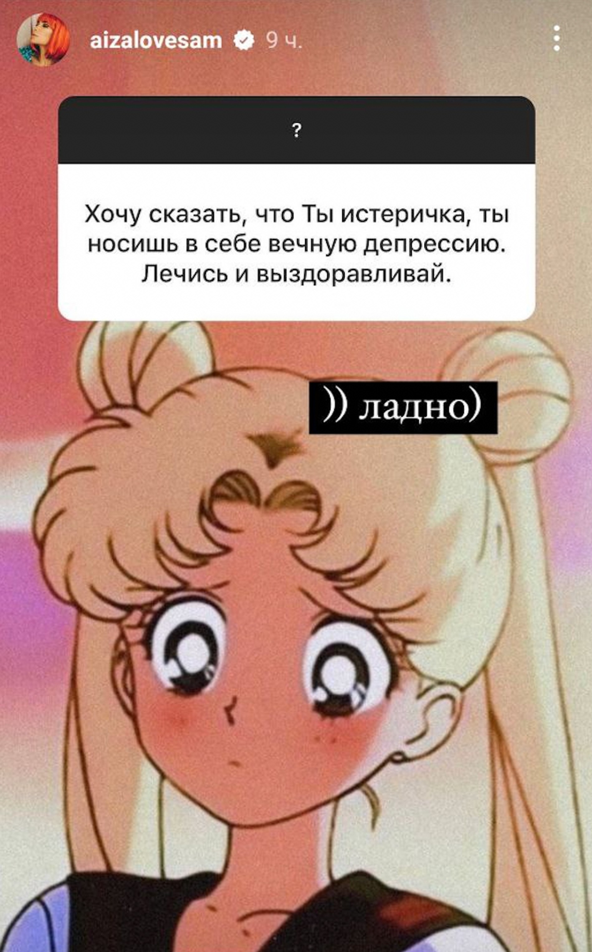 Лежа в постели Айза тем не менее решила не пропускать рубрику «вопрос-ответ» и пообщалась с подписчиками. Хотя, может, и зря. «Ты истеричка, ты носишь в себе вечную депрессию, лечись и выздоравливай», — написал ей кто-то очень «добрый» и «отзывчивый». Да уж, сомнительная поддержка в трудную минуту.