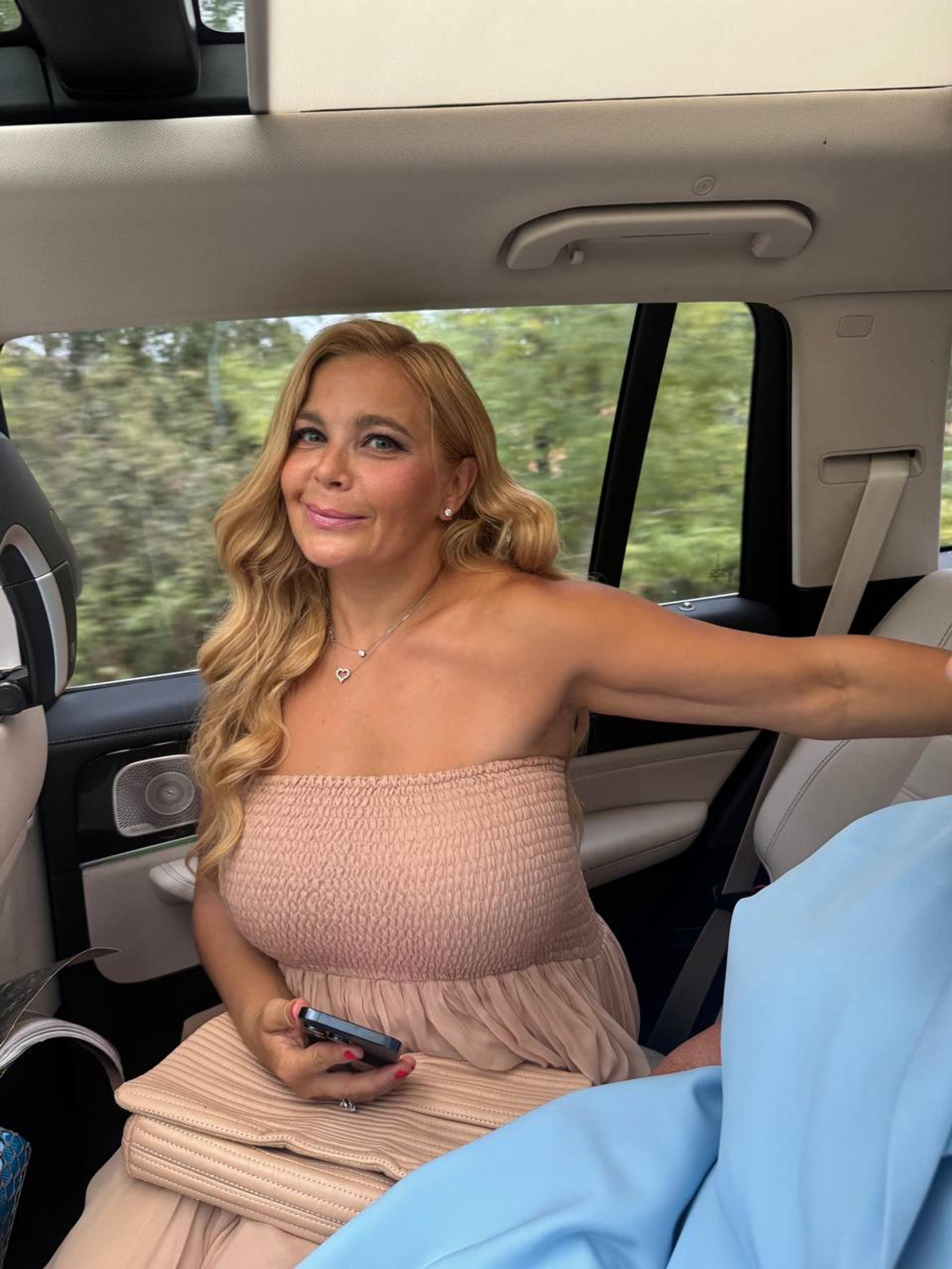 Немного позднее народная артистка РФ выложила фото из автомобиля, показав наряд, в котором она отправилась на торжество: платье-бандо нежного кофейного оттенка.