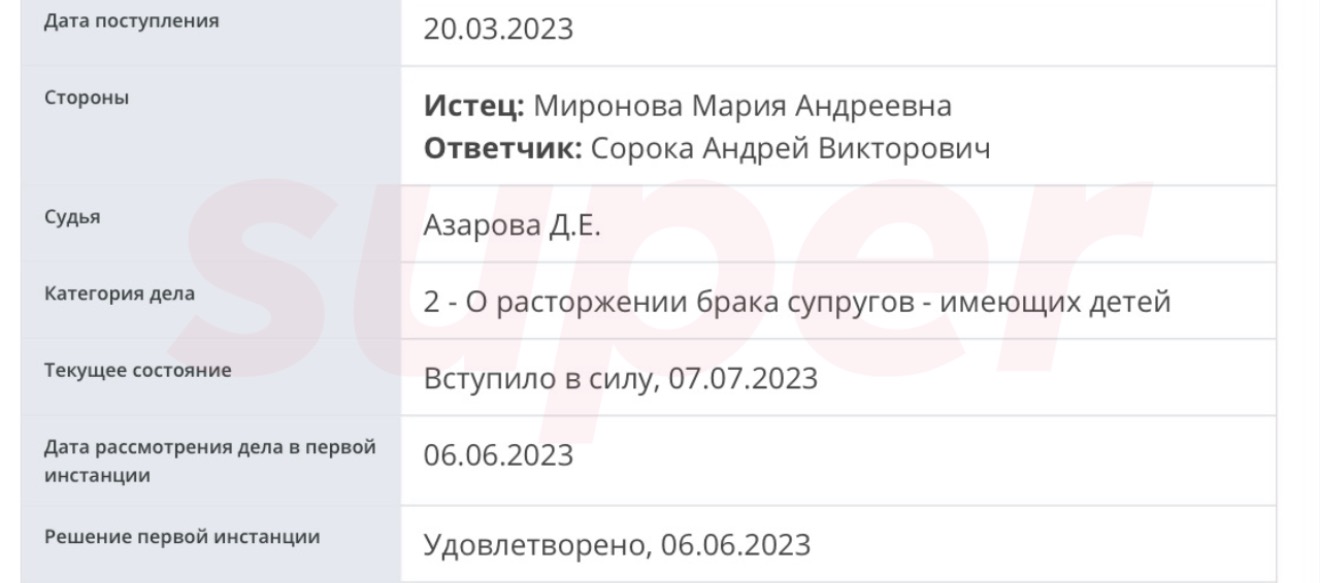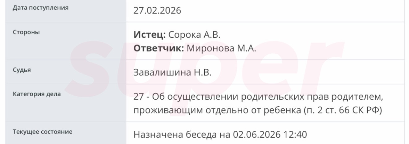 Тем не менее в феврале 2026 года Андрей Сорока, бывший муж актрисы, подал на Марию в суд. Он заявил, что его ограничивают в общении с шестилетним сыном. В настоящее время Сорока настаивает на том, чтобы Миронова разрешила ему встречаться с ребёнком и принимать участие в его воспитании.