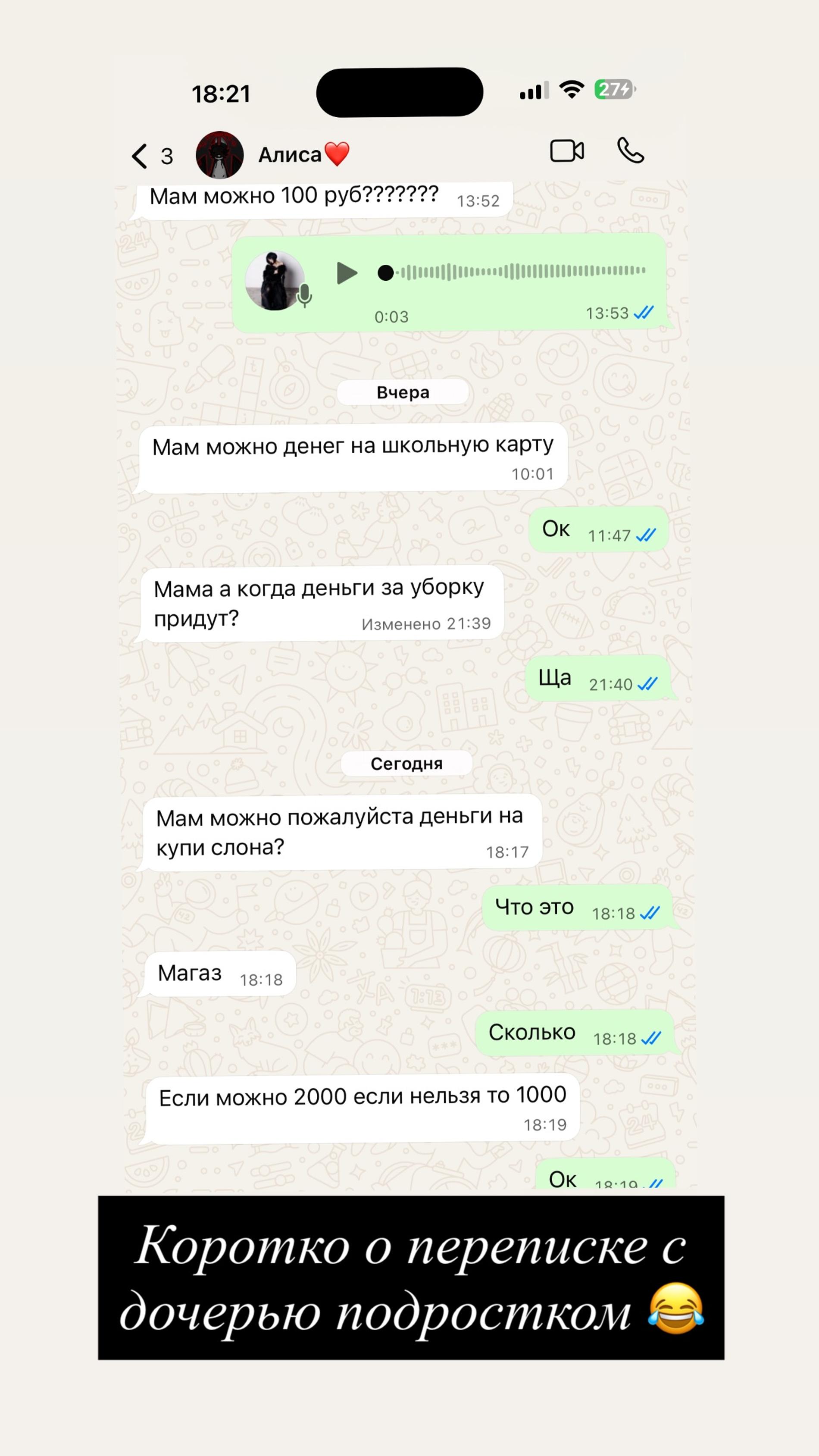 Модель и инфлюенсер Алана Мамаева поделилась в соцсетях забавной перепиской со своей дочерью – 10-летней Алисой. Алана опубликовала скриншот диалога в мессенджере с подписью: «Коротко о переписке с дочерью-подростком».