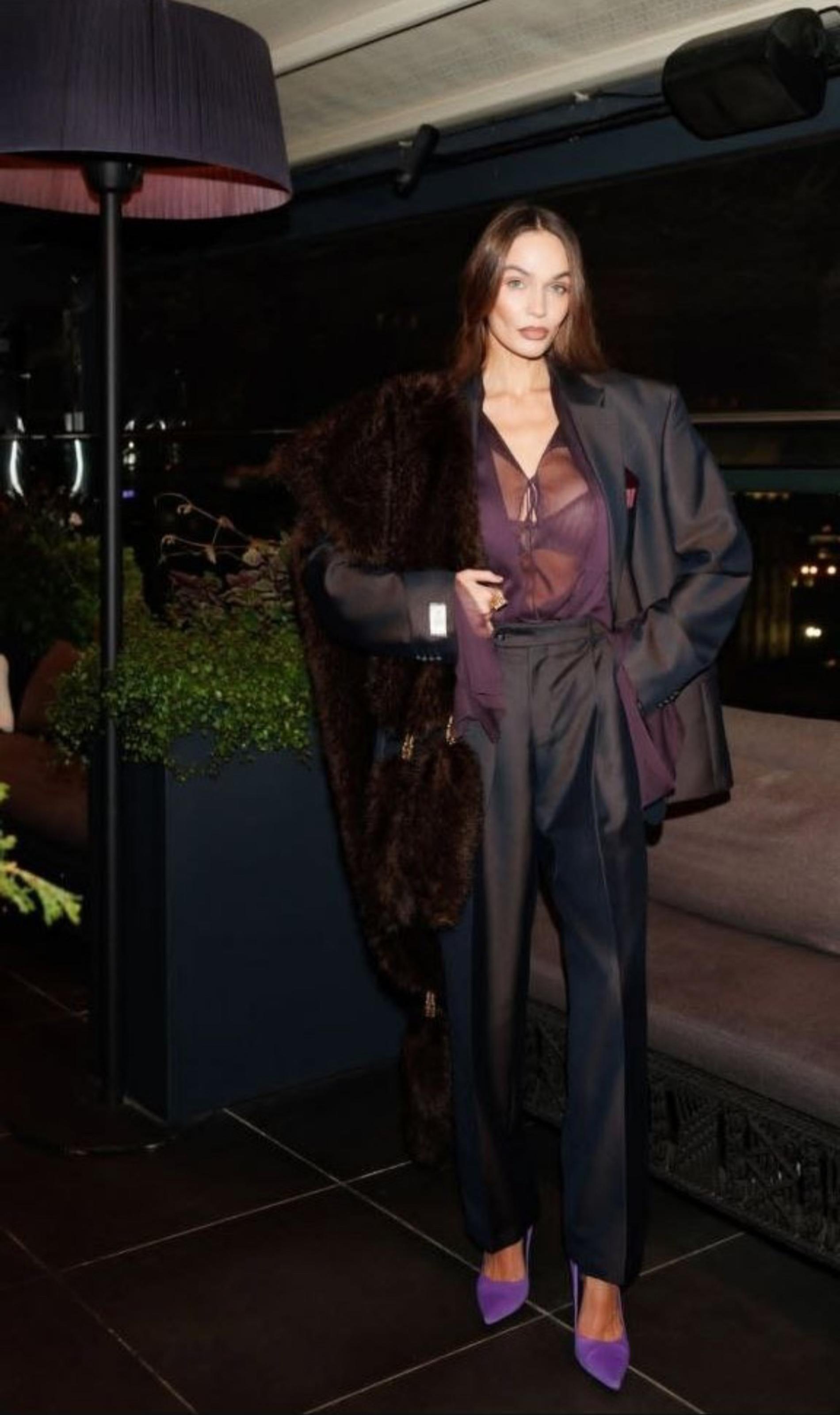 Образ Алёны был дополнен элегантным свободным пиджаком и меховой накидкой на одно плечо, что добавило образу изысканности и драматичности.