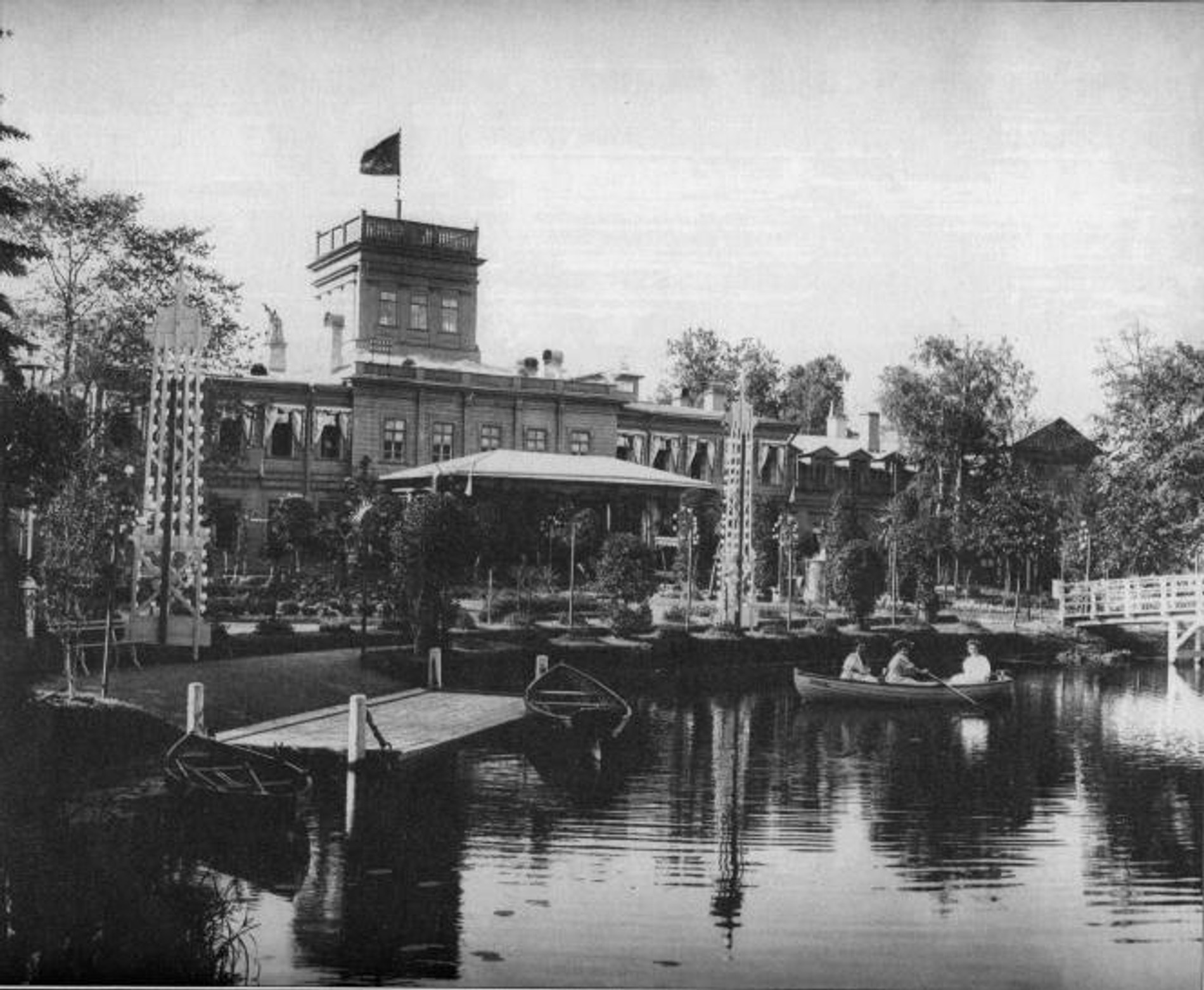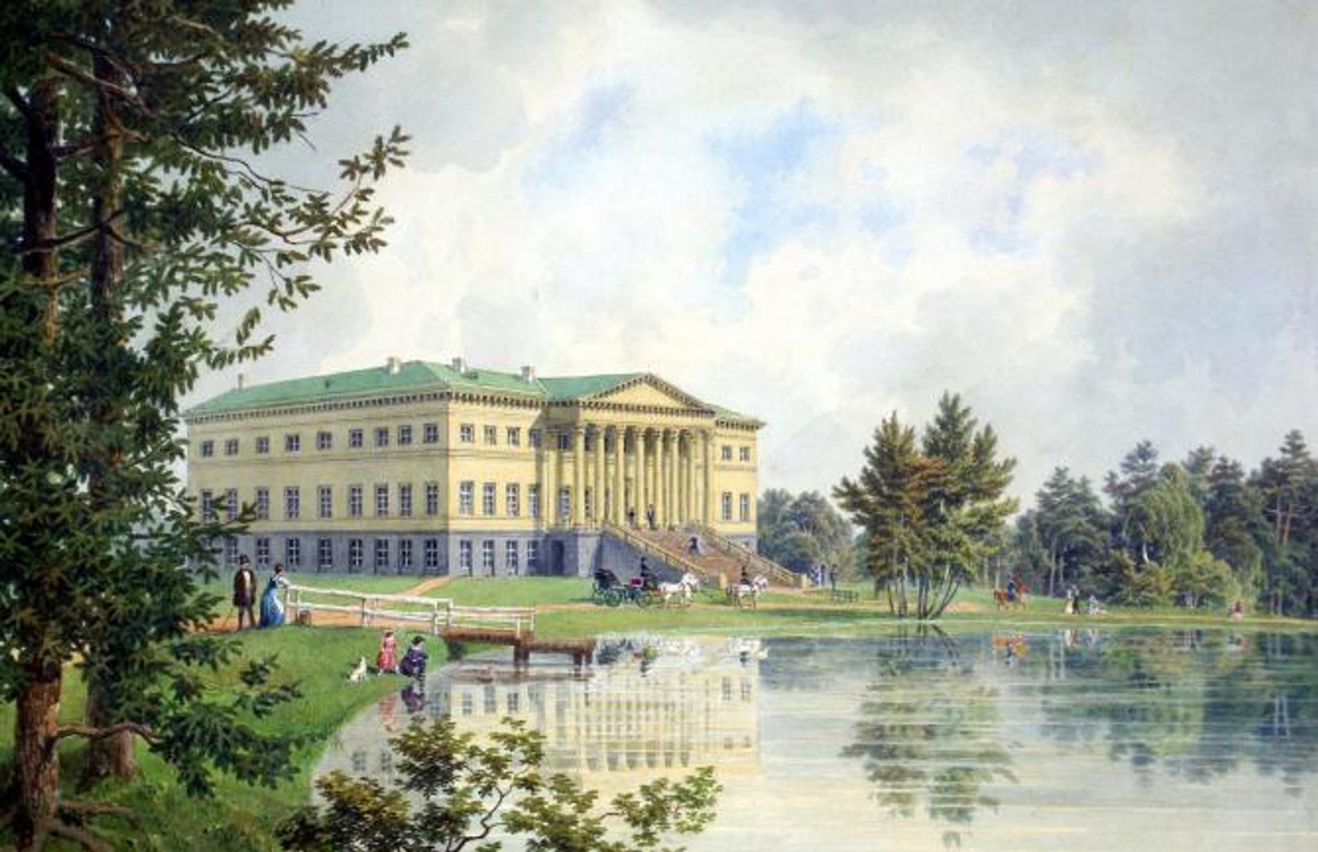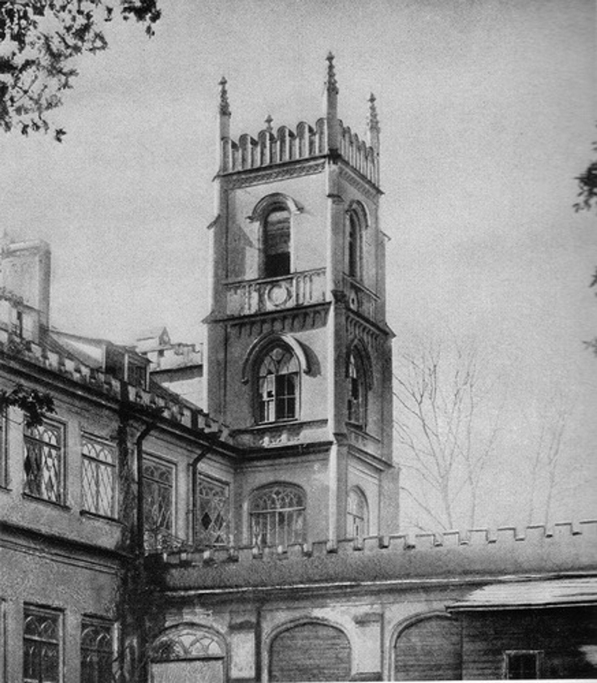 Неоготический дворец, подаренный Николаем I Ольге и Алексею Орловым, уже нельзя увидеть в первоначальном виде. В XIX веке его возвели по проекту Петра Садовникова. Своим фасадом деревянный дворец выходил на берег пруда, по обеим сторонам террасы стояли главные украшения — скульптуры чугунных орлов на шарах (символ рода Орловых). С северной стороны возвышалась четырехэтажная башня, кровлю которой ограждал зубчатый парапет.