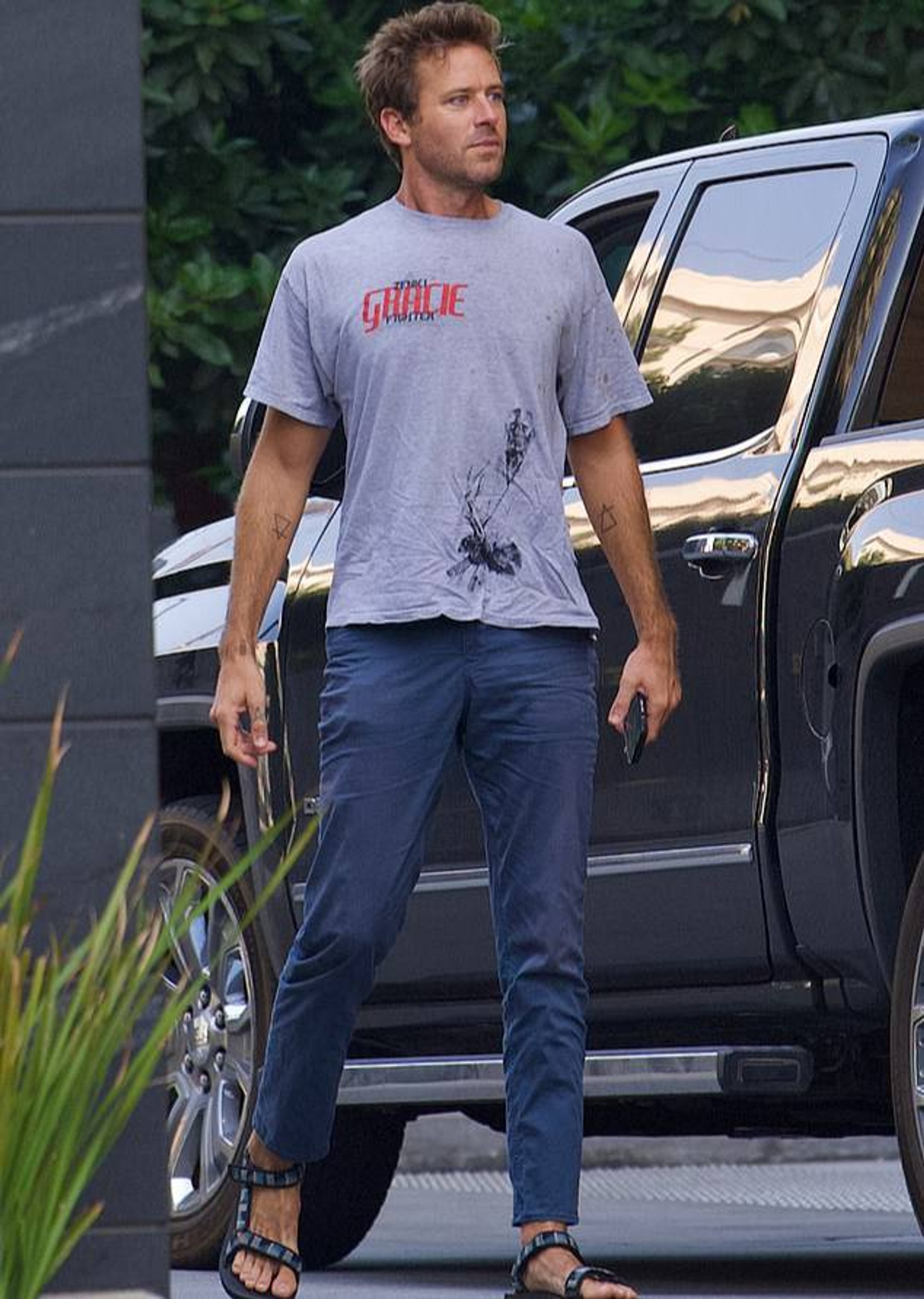 Ну а в июле 2022 года он неожиданно почему-то вернулся в Лос-Анджелес, да еще и угодил в объективы папарацци. Бедняжка, видимо, забыл, что в Калифорнии фотографы на каждом шагу. Вид у Хаммера на фото, мягко скажем, не очень: растянутая футболка не по размеру, помятое лицо, растрепанные волосы. Что делал бывший актер и куда направлялся в таком образе, остается только догадываться.