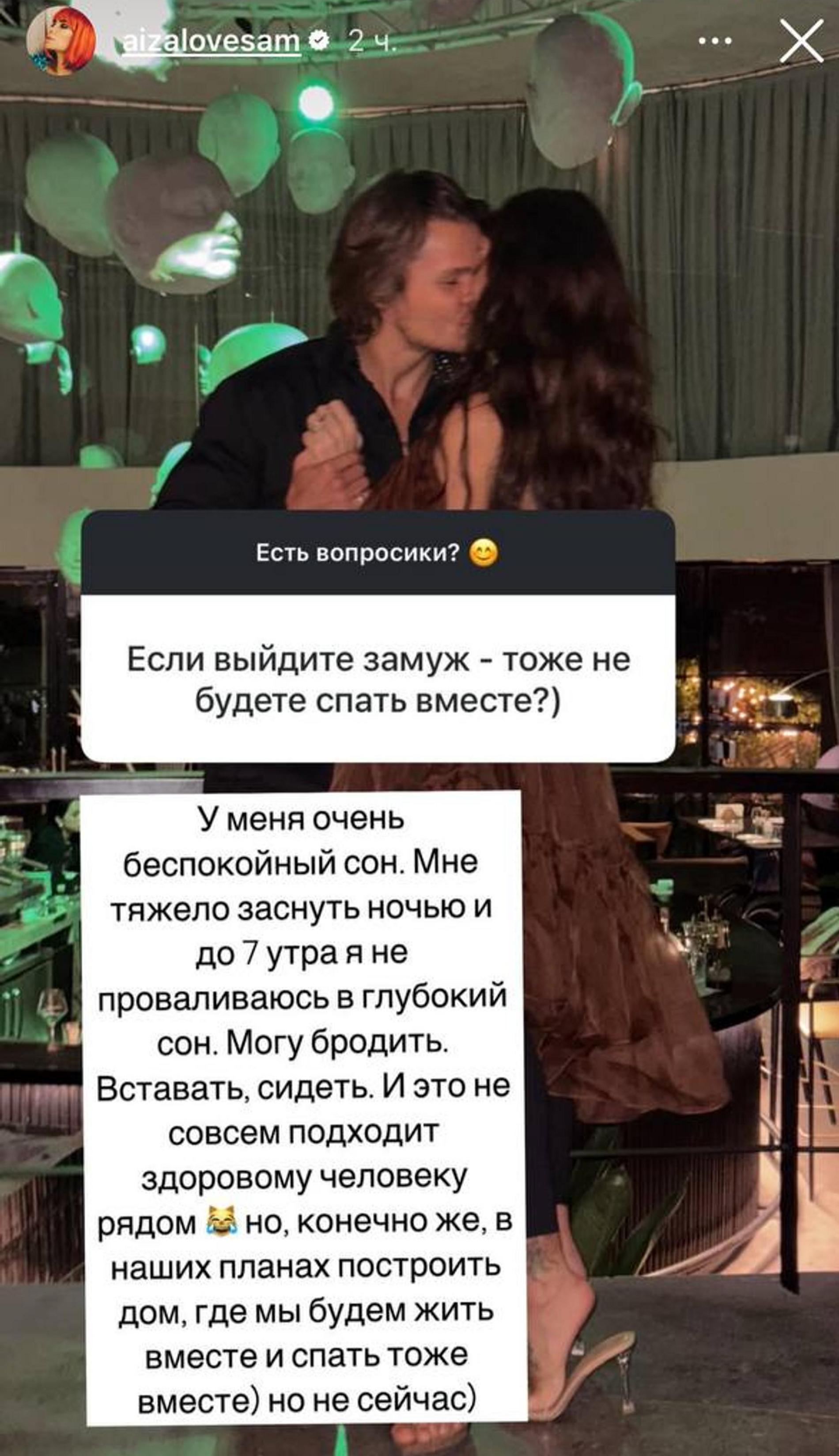 Отвечая в инстаграме* на вопрос, собирается ли Айза спать отдельно от избранника в случае замужества, она призналась: у нее весьма беспокойный сон, который может не совсем подойти «здоровому человеку рядом». Однако она не исключает, что в будущем все будет иначе. «Конечно же, в наших планах построить дом, где мы будем жить вместе и спать тоже вместе», — высказалась блогер, но быстро добавила, что все произойдет не в ближайшее время.