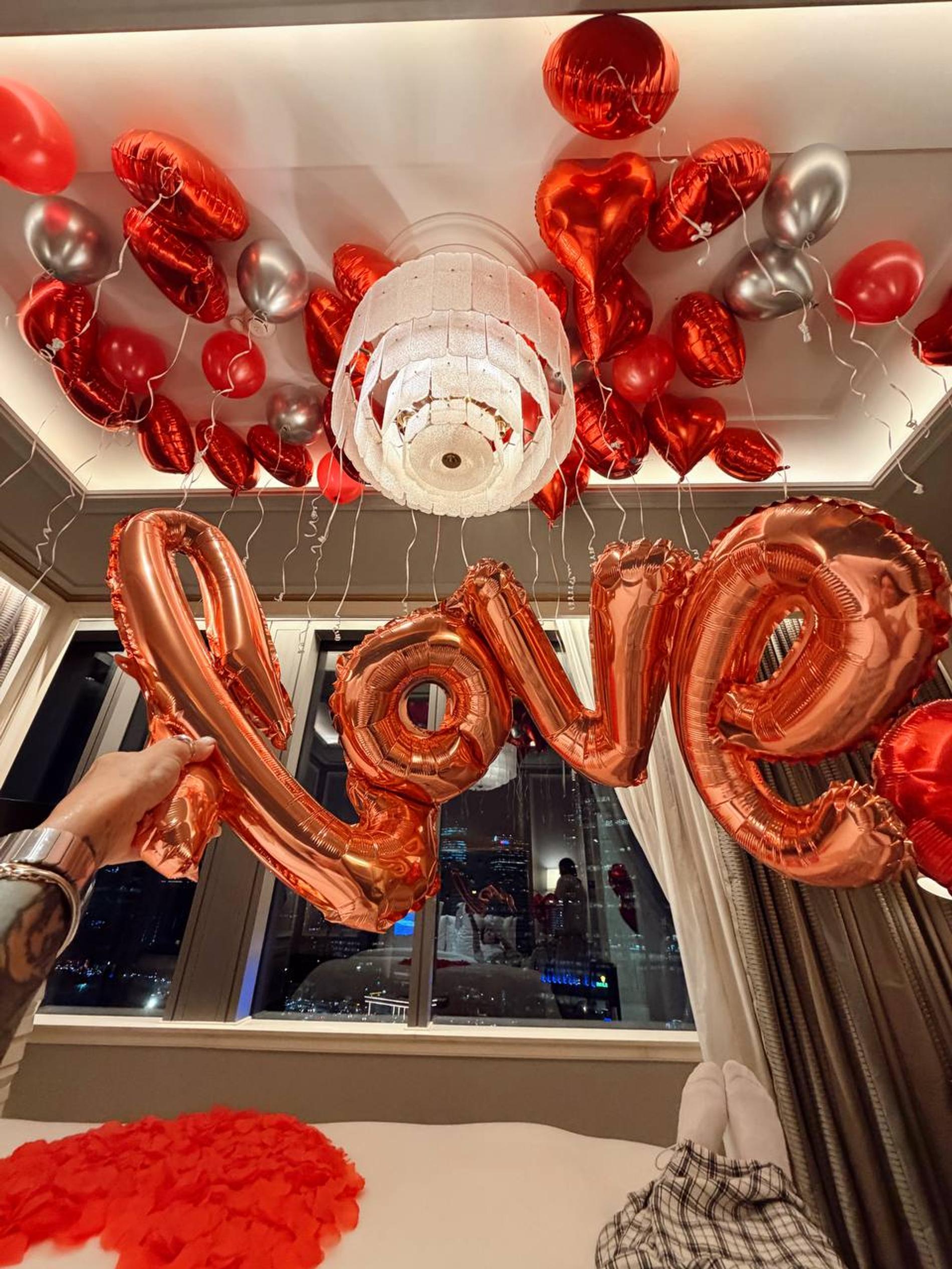 Айза-Лилуна Ай поделилась радостью в личном блоге. Возлюбленный Степан Кузьменко подготовил ей эффектный романтический сюрприз: забронировал номер в роскошном отеле и позаботился, чтобы он был щедро украшен шарами в форме сердец и лепестками роз.