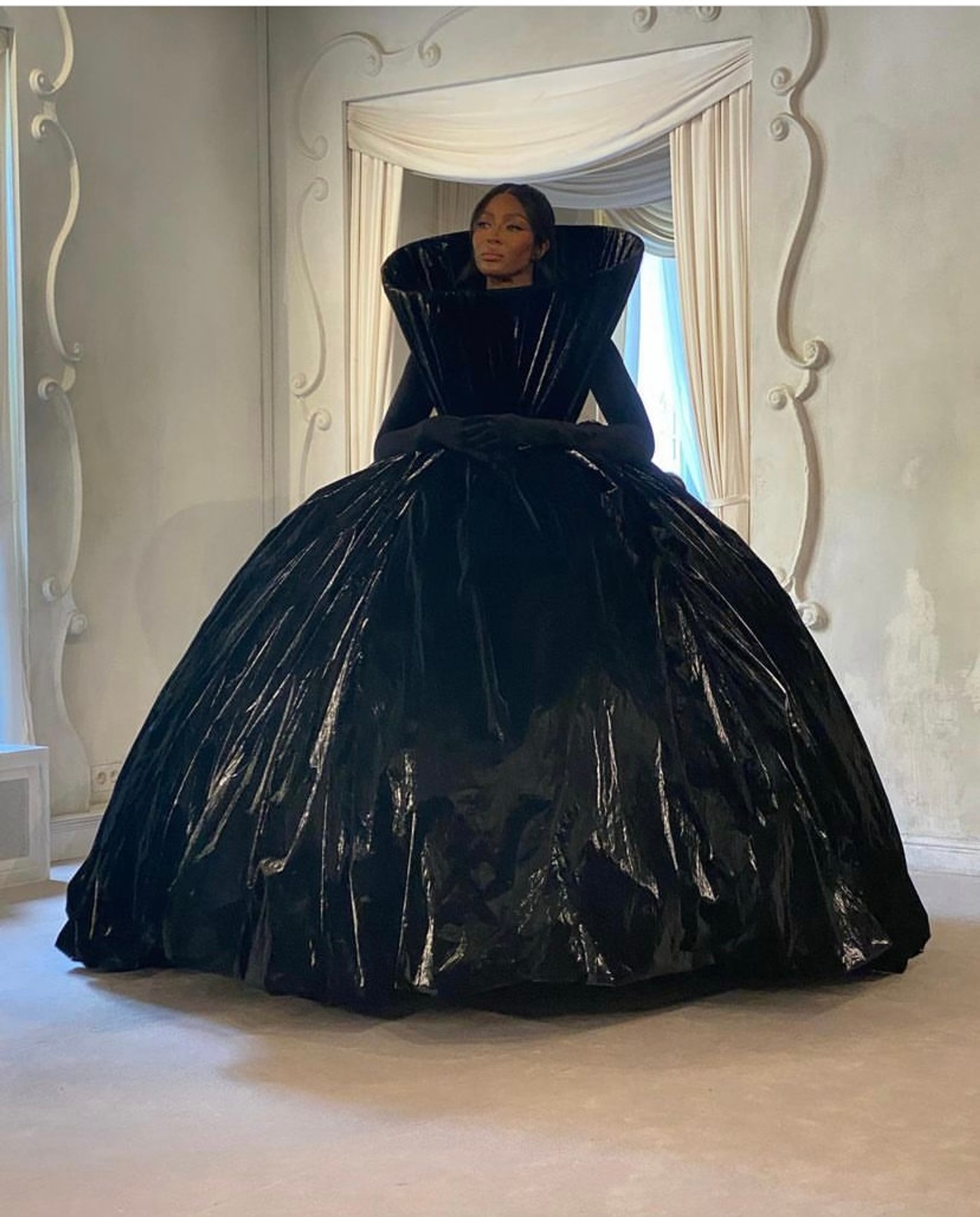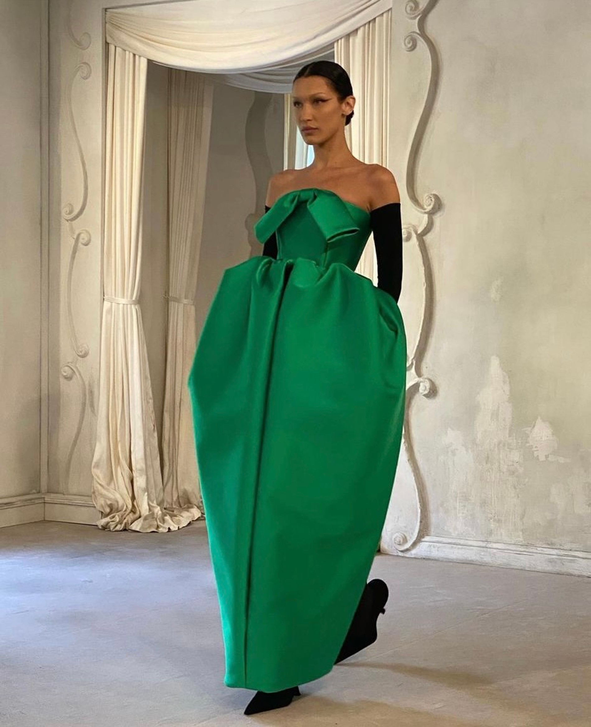 Вышли на шоу и несколько профессиональных топ-моделей: Наоми Кэмпбелл продемонстрировала черное пышное платье (этакое анти-платье невесты), а Белла Хадид дефилировала в изумрудном крученом банте и длинных черных перчатках.