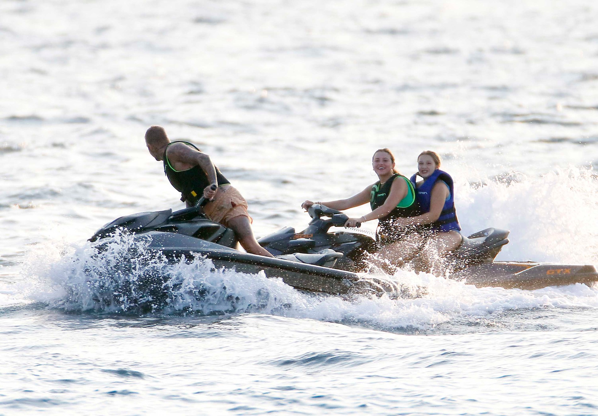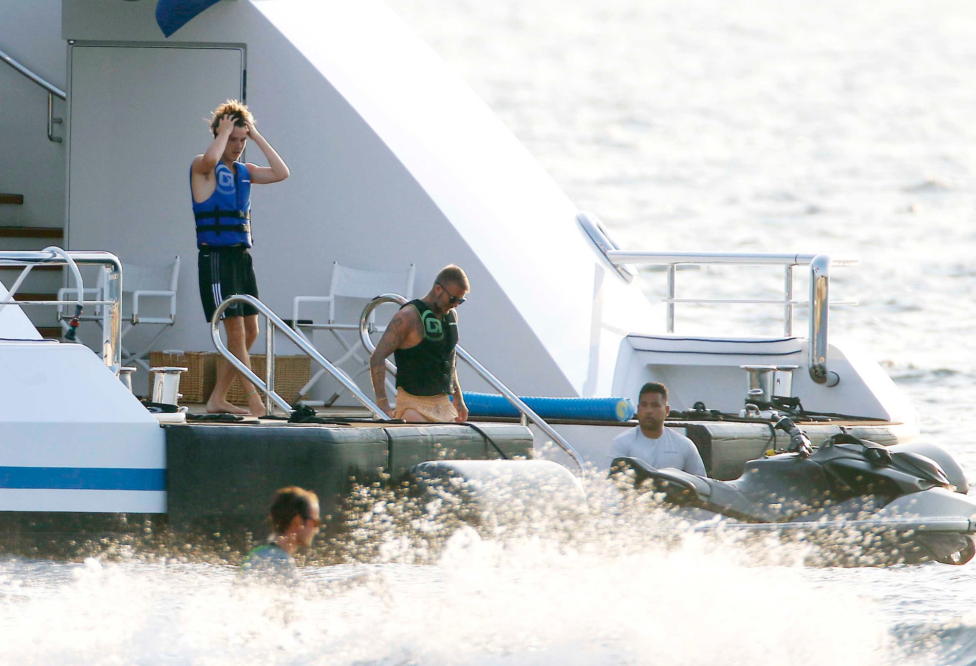 Вечером в среду предлагаем отвлечься от дел рабочих и проследовать прямиком на белоснежную яхту к отдыхающей семье Бекхэмов. В процессе фотоэкскурсии у нас с вами есть уникальная возможность понаблюдать за Дэвидом Бекхэмом в непринужденной атмосфере повседневности. Как мы видим, знаменитый футболист все так же хорош собой и улыбчив. Занимается тем же, чем и все обычные люди: общается, купается, загорает и гоняет с довольными детьми на скутере. Супруга Виктория куда более праздно проводит время (по крайней мере, на фото): загорает почему-то даже не в сногсшибательном купальнике, а в обыденном спортивном черном комплекте и ведет беседы. Экскурсия у нас с вами визуальная, так что можем лишь догадываться, о чем говорят звезды. Ну а в целом очевидно тут сплошная гармония, идиллия, релакс и все такое. И слава богу.