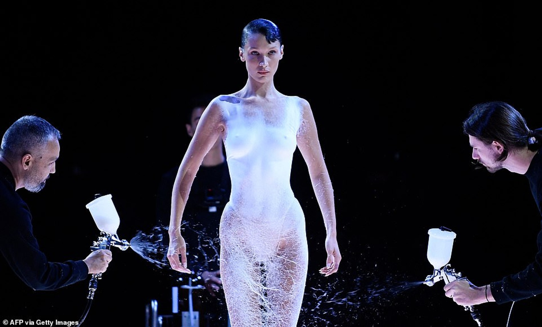 Такого вы еще не видели: на голую Беллу Хадид распыляют платье из жидкой ткани