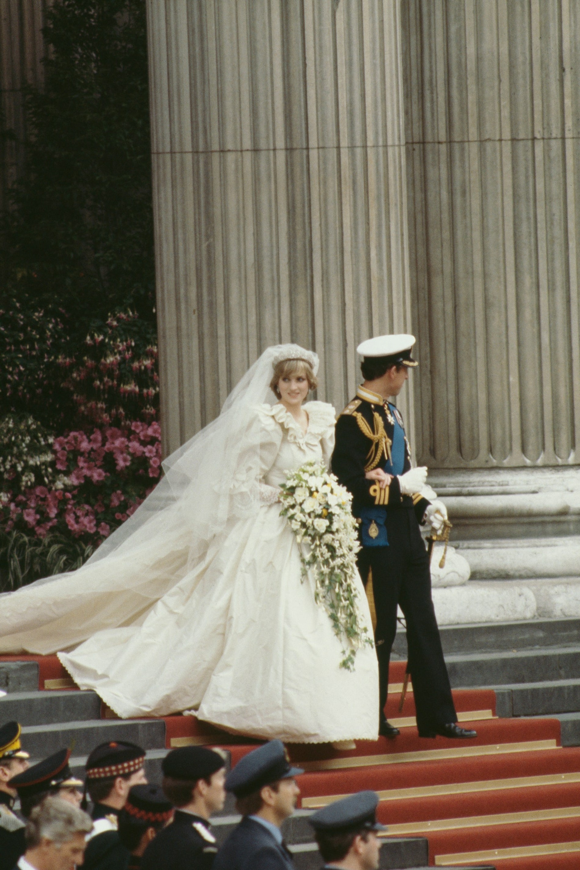 Свадебное платье принцессы Дианы сшили для нее малоизвестные на тот момент молодые валлийские дизайнеры Дэвид и Элизабет Эмануэль. Они использовали шелк цвета слоновой кости, украсили его множеством жемчужин и блестками, а также старинным кружевом. Образ был завершен самым длинным шлейфом в истории королевских свадеб — 25 футов, также платье выделялось своими пышными рукавами.