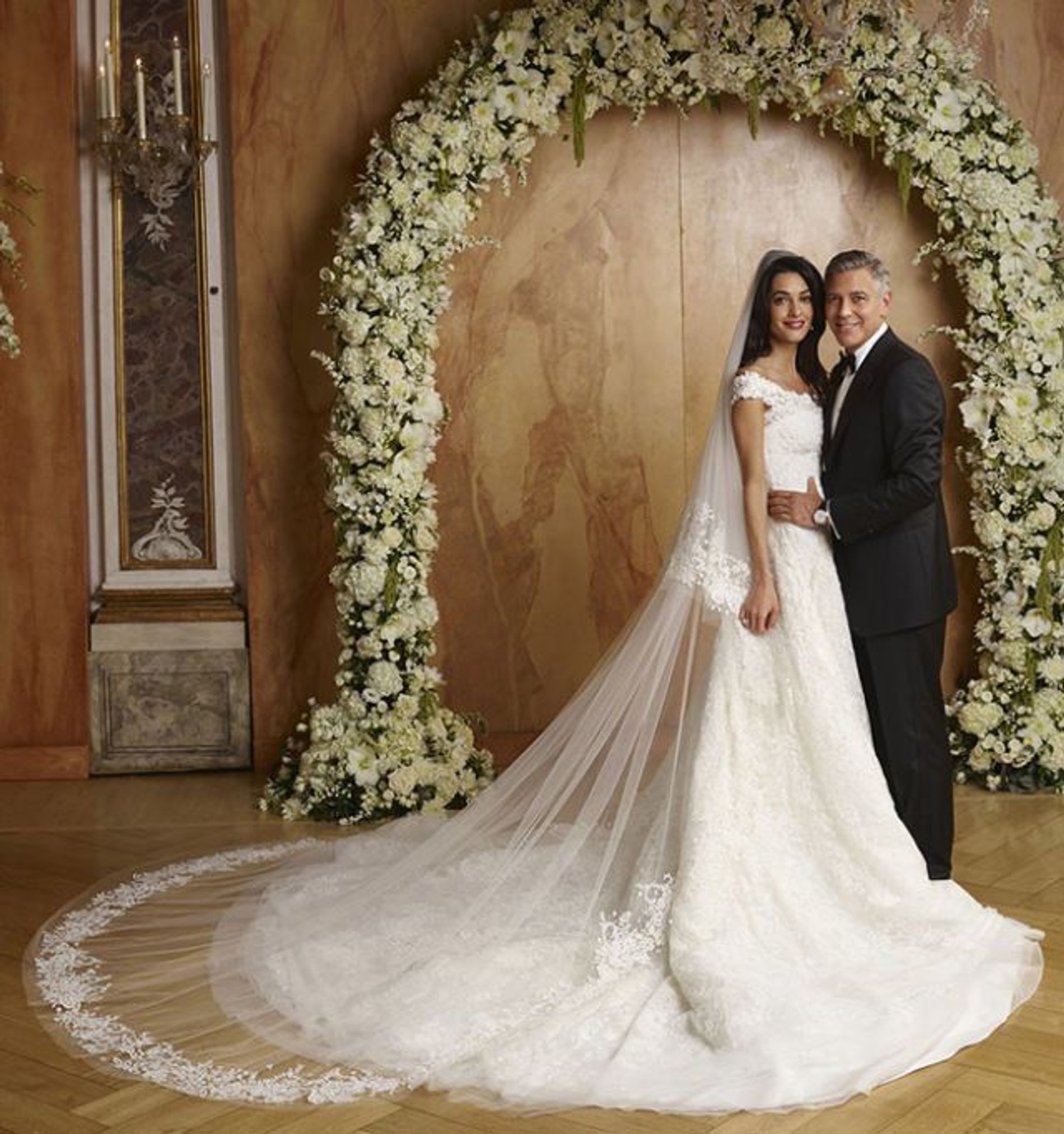 Невеста Джорджа Клуни и известный адвокат Амаль Аламуддин хотела выглядеть на свадьбе элегантно и роскошно. Специально для нее легендарный кутюрье Оскар де ла Рента создал нежное платье, для изготовления которого использовали 12 метров французского кружева, расшитое сотней бусин и жемчужин. Амаль предпочла открытые плечи и длинную фату, также украшенную по подолу кружевом и вышивкой из бисера и хрусталя.