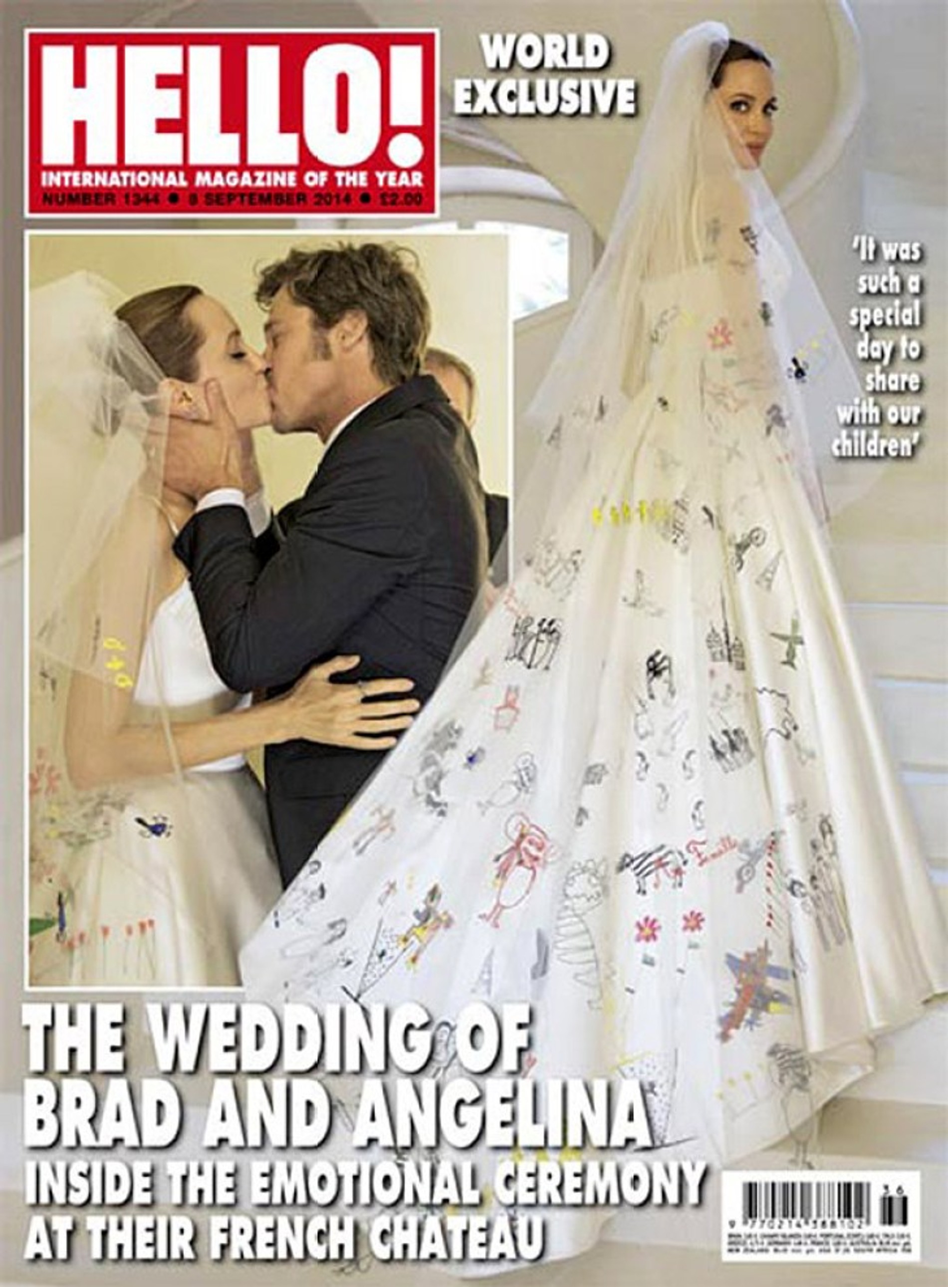 Платье одной из главных голливудских красавиц Анджелины Джоли было на удивление скромным, элегантным и нежным. Главной его изюминкой стали забавные рисунки шестерых детей Анджелины и Брэда Питта, которые украшали платье и фату невесты.