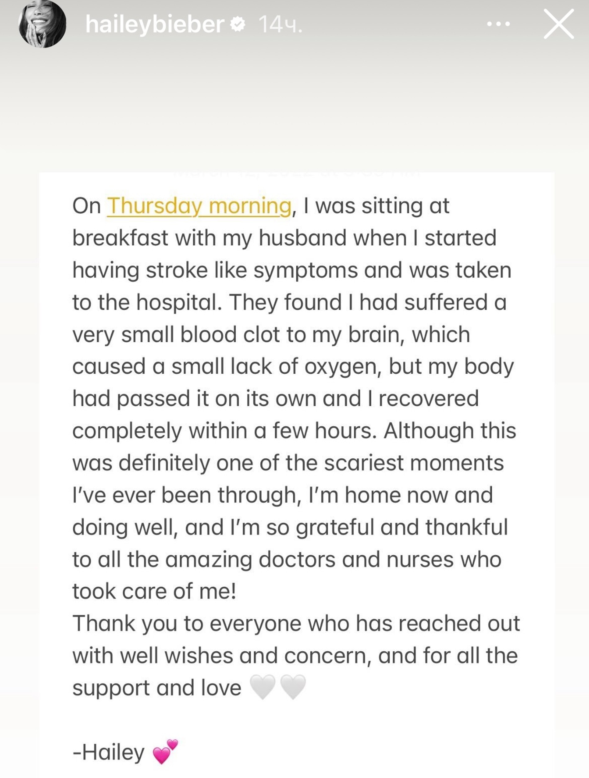 Супруга Джастина Бибера Хейли вышла на связь со своими подписчиками после новостей о ее госпитализации с поражением головного мозга. Хейли рассказала, что это был один из самых страшных моментов в ее жизни.