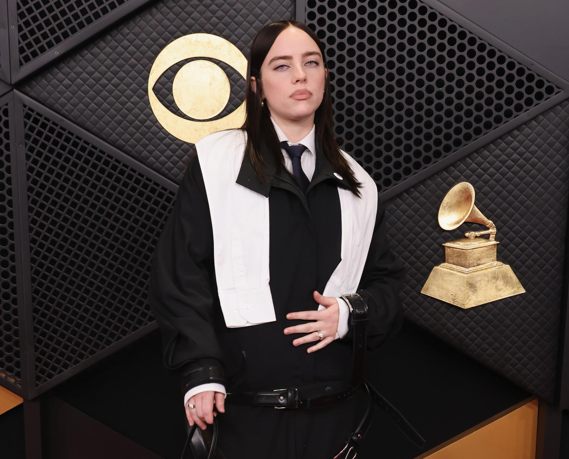Звезда предстала перед публикой в монохромном готическом образе. На левой руке певицы было кольцо с драгоценным камнем — украшение привлекло внимание, когда исполнительница положила руку на живот.