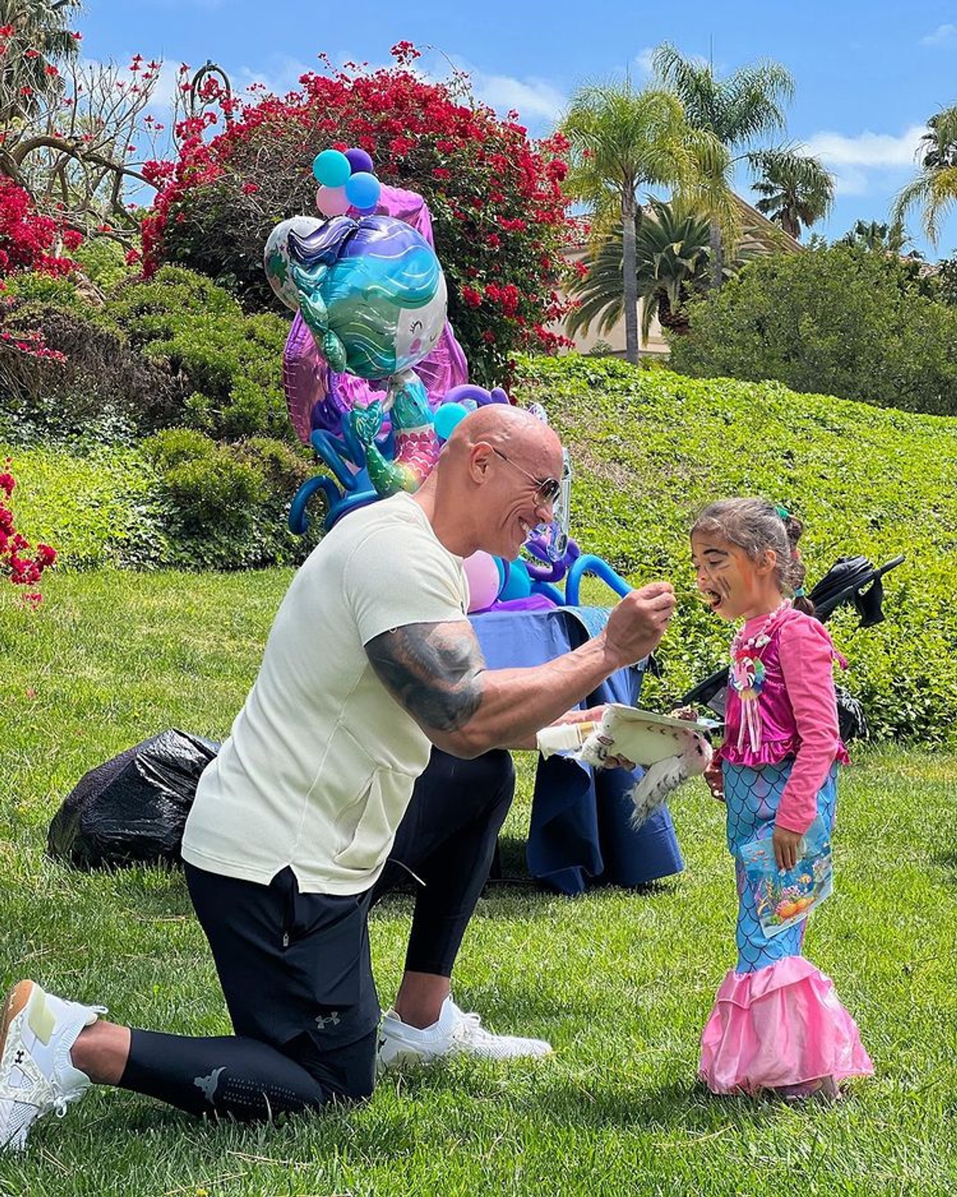 Дуэйн Джонсон живет в настоящем цветнике — он счастливый отец троих дочерей. Вчера его младшенькой исполнилось 4 года. В честь дочки Тианы папа устроил вечеринку в стиле Русалочки, где были все главные атрибуты праздника: шарики, торт и даже большая пиньята.