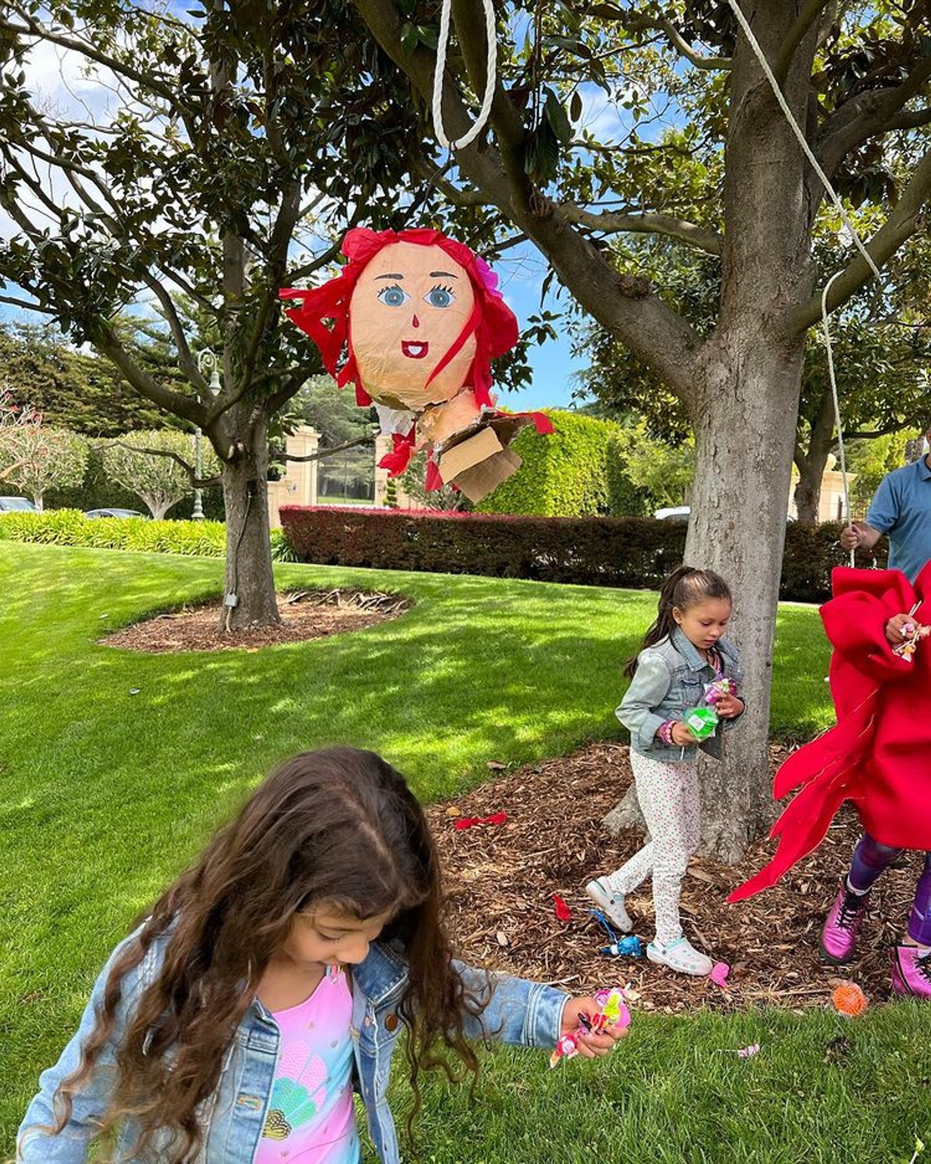 Ну а после поедания торта Джонсон и Тиана отправились ярко завершать день рождения — разбивать пиньяту (игрушка с конфетами внутри). Дуэйн взял дочку на руки и помог ей оставить от Русалочки одну голову.