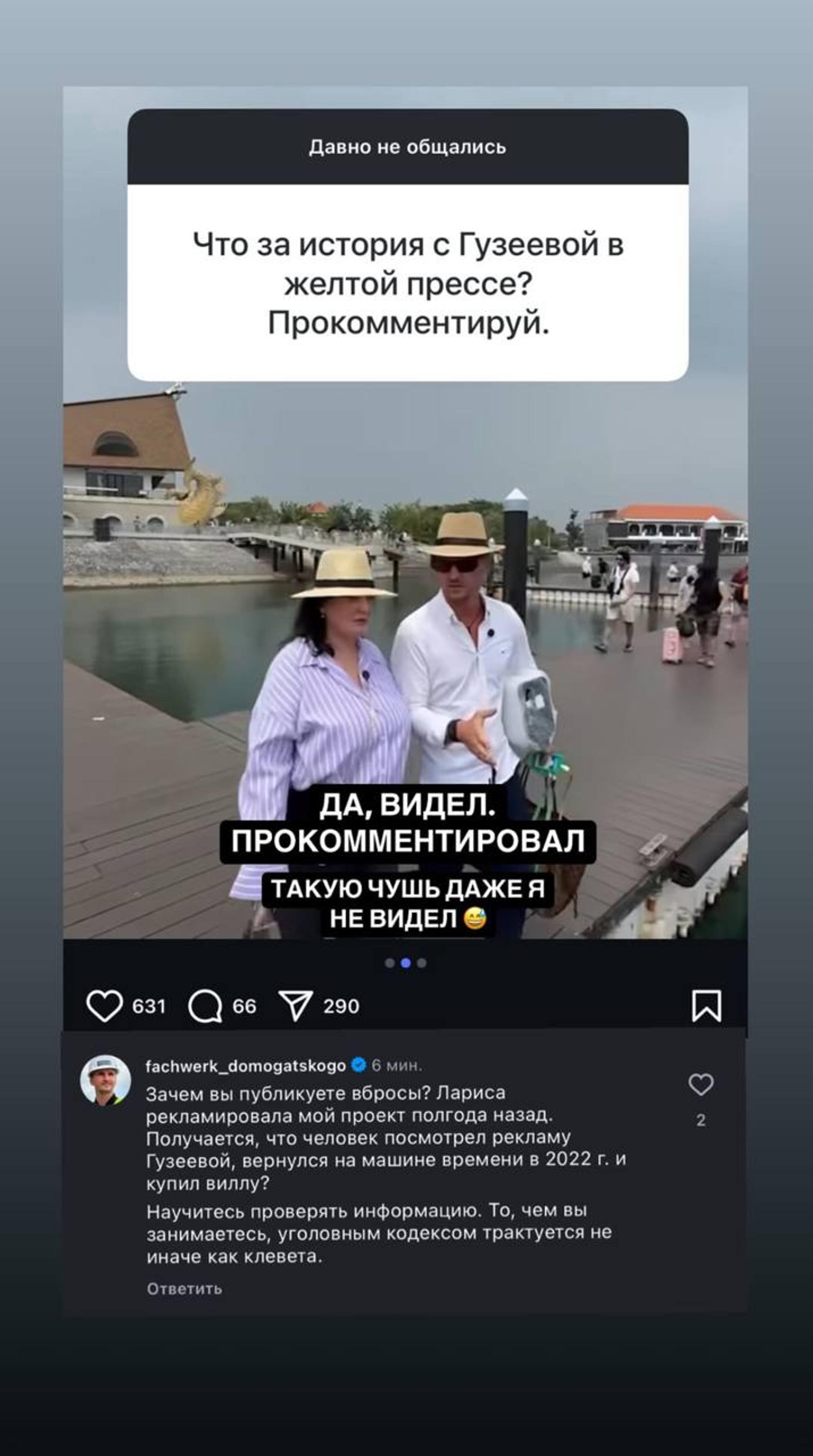 Бизнесмен Сергей Домогацкий, из-за видео которого Ларису Гузееву обвинили в мошенничестве, прокомментировал скандал. В личном блоге в запрещённой соцсети предприниматель уточнил, что телеведущая снималась в его ролике полгода назад, при этом пострадавшие заявляют, что приобрели недвижимость в 2022. «Зачем вы публикуете вбросы? Лариса рекламировала мой проект полгода назад. Получается, что человек посмотрел рекламу Гузеевой, вернулся на машине времени в 2022 год и купил виллу?» — написал он.