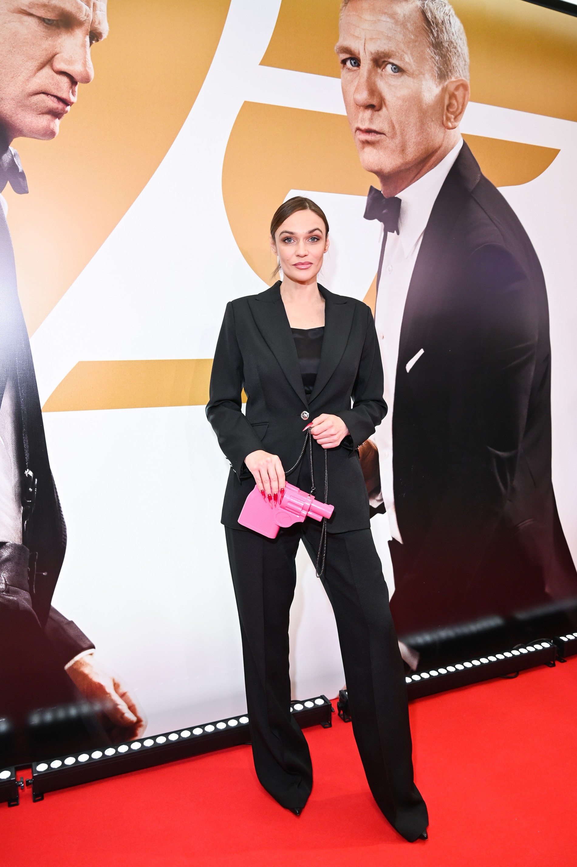 Так, Алена Водонаева появилась перед журналистами в брючном костюме, дополнив образ розовым клатчем в форме пистолета. Телеведущая призналась, что этот Джеймс Бонд для неё первый, ни одну часть про агента 007 она ранее не смотрела.