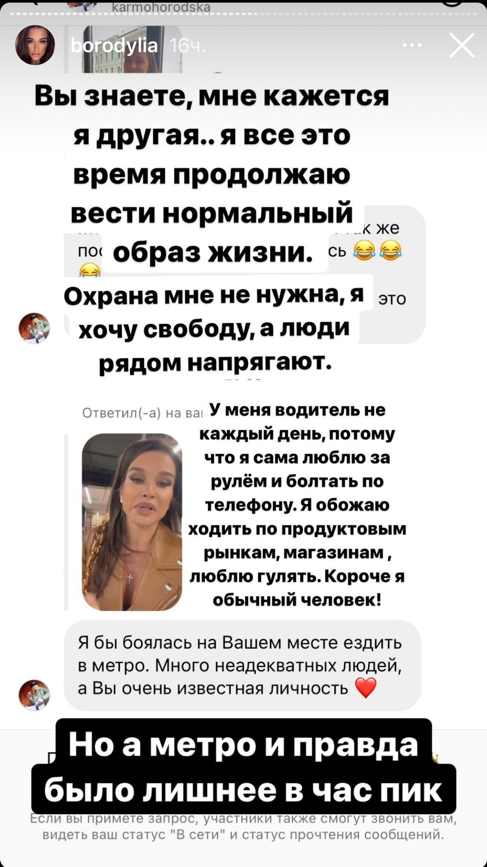 Подписчики поддержали ведущую и уточнили, что Ксения — известная личность и ей небезопасно спускаться одной в метро. На что Бородина ответила, что охрана ей не нужна, ведь она обычный человек.