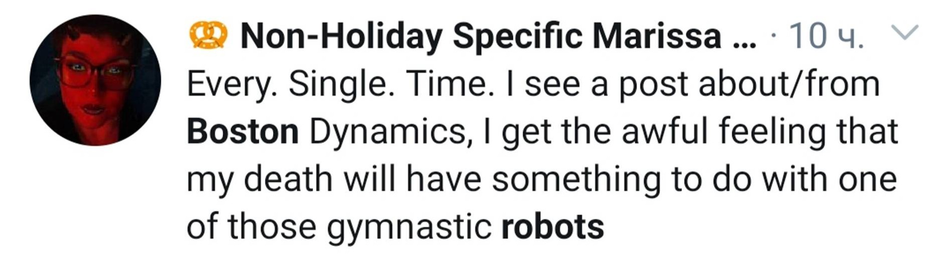 «Каждый раз, когда я вижу пост от Boston Dynamics, у меня ужасное чувство, что моя смерть будет как-то связана с одним из этих роботов-гимнастов»