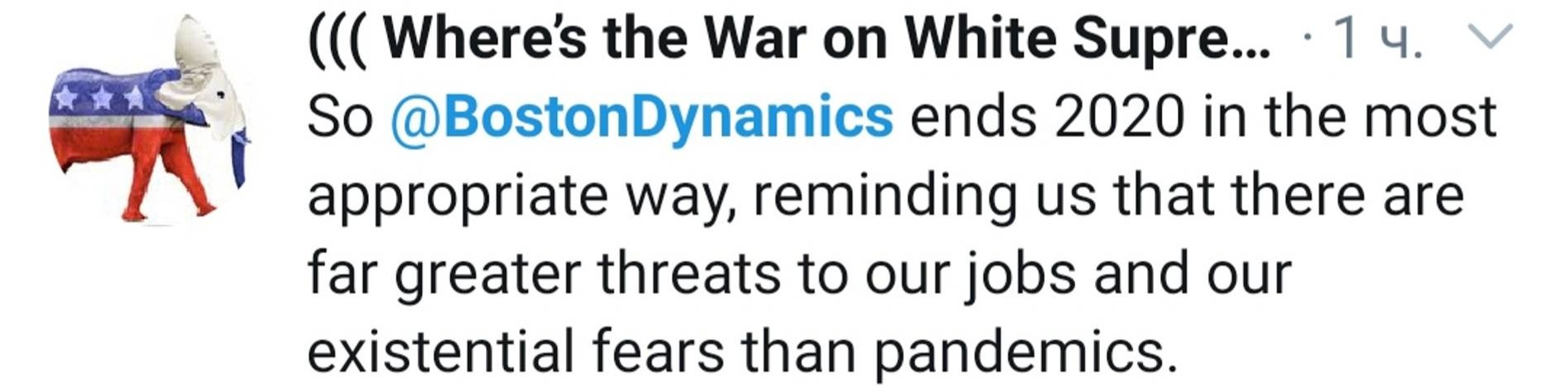 «Boston Dynamics заканчивает 2020-й как положено: напоминая нам, что есть куда большие угрозы нашей работе и экзистенциальным страхам, чем пандемия»