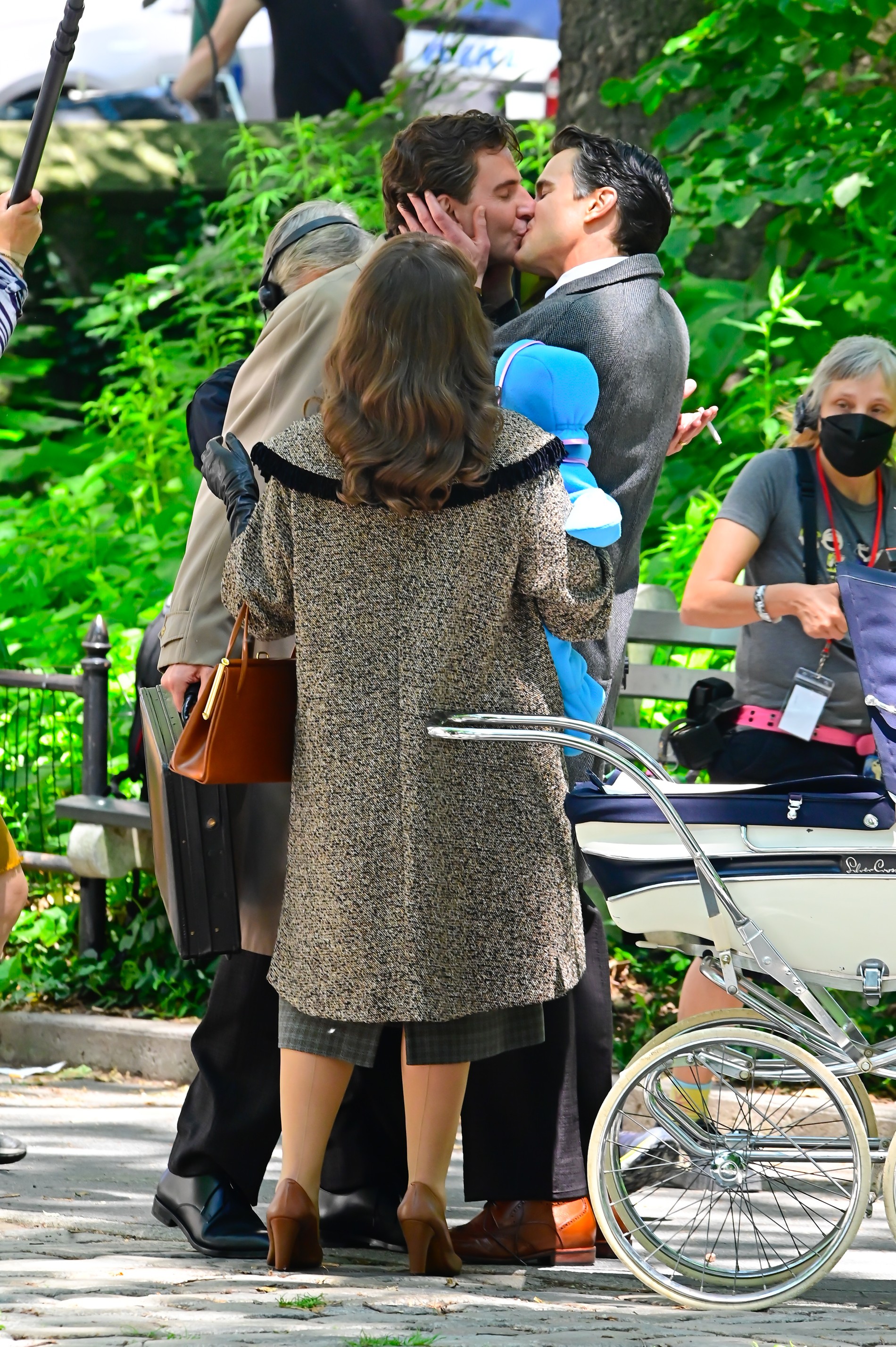 Какая романтика: 47-летний Брэдли Купер и 44-летний Мэтт Бомер целуются на улицах Нью-Йорка. Чего только не сделаешь для нового фильма Netflix «Маэстро». Биографическая лента, рассказывающая о жизни музыканта Леонарда Бернстайна, выйдет на экраны в 2023 году.