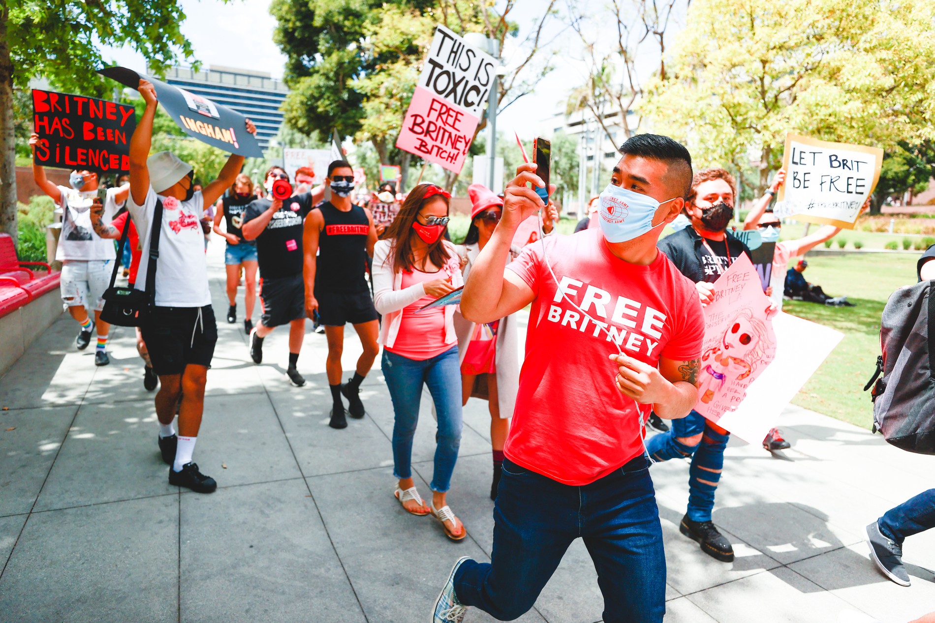 Напомним, недавно в Сети набрало популярность движение #FreeBritney. Поклонники посчитали, что певица находится в плену у своего отца Джейми Спирса, который владеет контролем не только над ее финансами, но и над всей жизнью артистки. Фанаты просили звезду надеть желтое, если что-то не в порядке, а в следующих роликах она появлялась именно в этом цвете. В феврале насчет Джейми высказался и бойфренд певицы — 27-летний фитнес-тренер Сэм Асгари. Они вместе уже четыре года, однако отец Спирс против развития их отношений и свадьбы, а без его разрешения Бритни не имеет права выходить замуж. Перед судом Сэм выложил фото, на котором он позирует в футболке с этим хештегом.