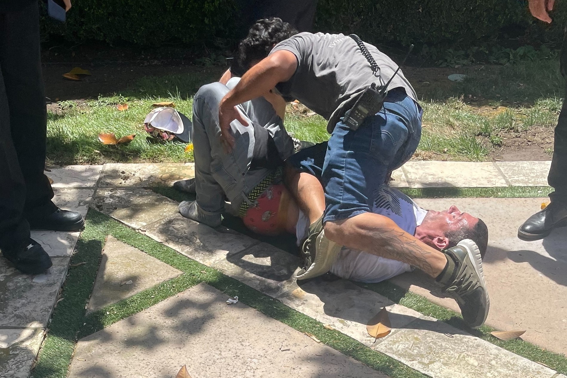 Судя по кадрам, ему удалось миновать охрану после небольшой потасовки и он попал внутрь. Но радость длилась недолго. Бунтаря быстро задержали.