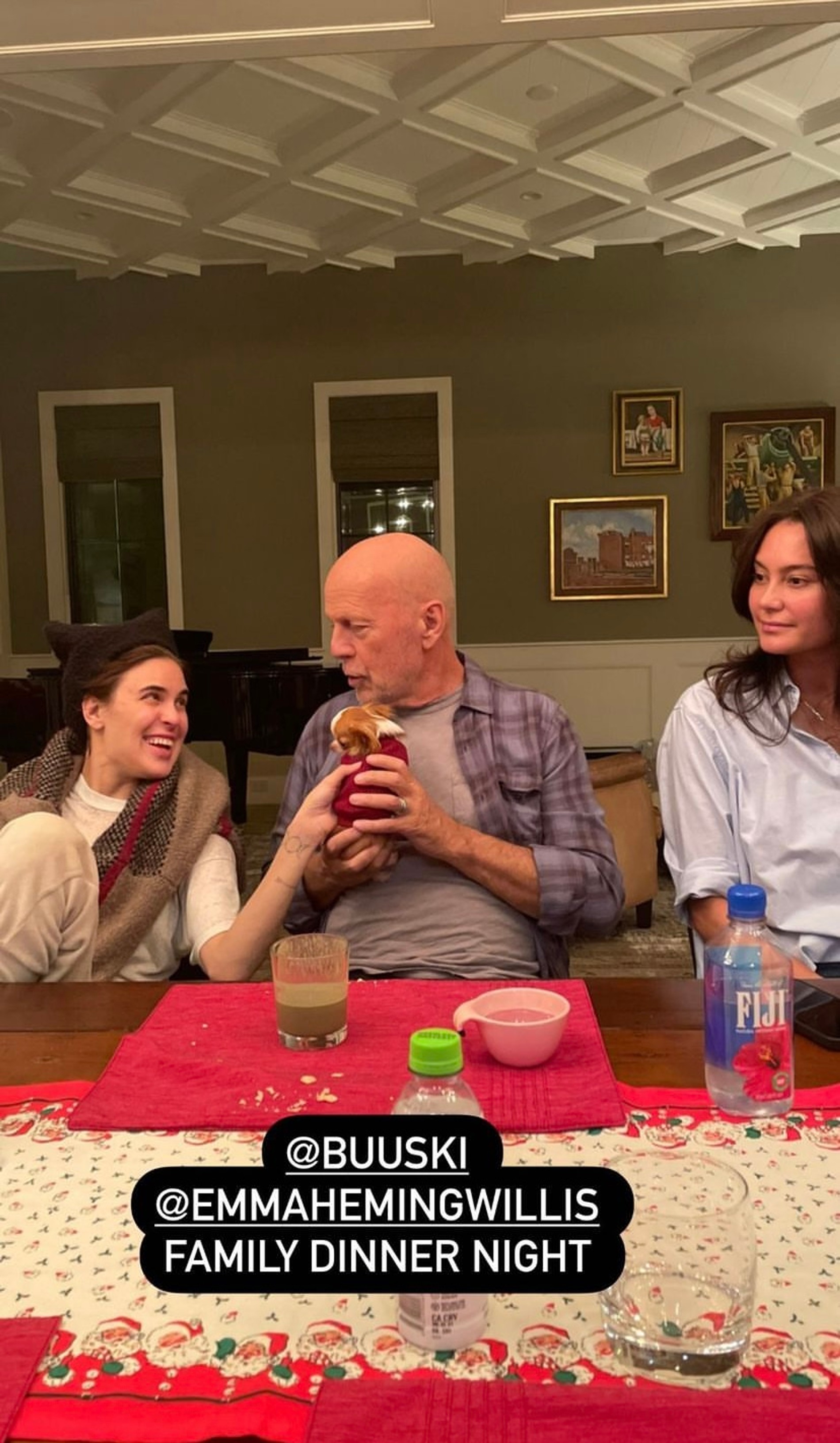 В своем блоге 28-летняя Талула Уиллис выложила снимки с семейного ужина. На фото девушка вместе с отцом, мамой Деми Мур и любимым питомцем. «Я люблю своих родителей и свою семью — я люблю, я люблю, я люблю!» — написала Талула. Застолье запечатлела еще одна дочь Деми и Брюса, 31-летняя Скаут. На фото попала и молодая жена актера, 44-летняя фотомодель Эмма Хеминг. В общем, за Брюса мы спокойны.
