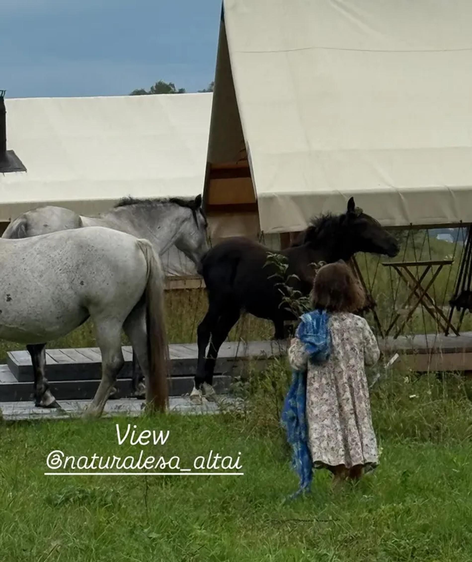 Помимо откровенных кадров, режиссёр опубликовала фотографии с фермы, где отдыхала вместе с дочерью Одой-Валентиной. Девочку сняли со спины — в длинном платье и с синим платком на плечах. Родители по-прежнему предпочитают не показывать её лицо.