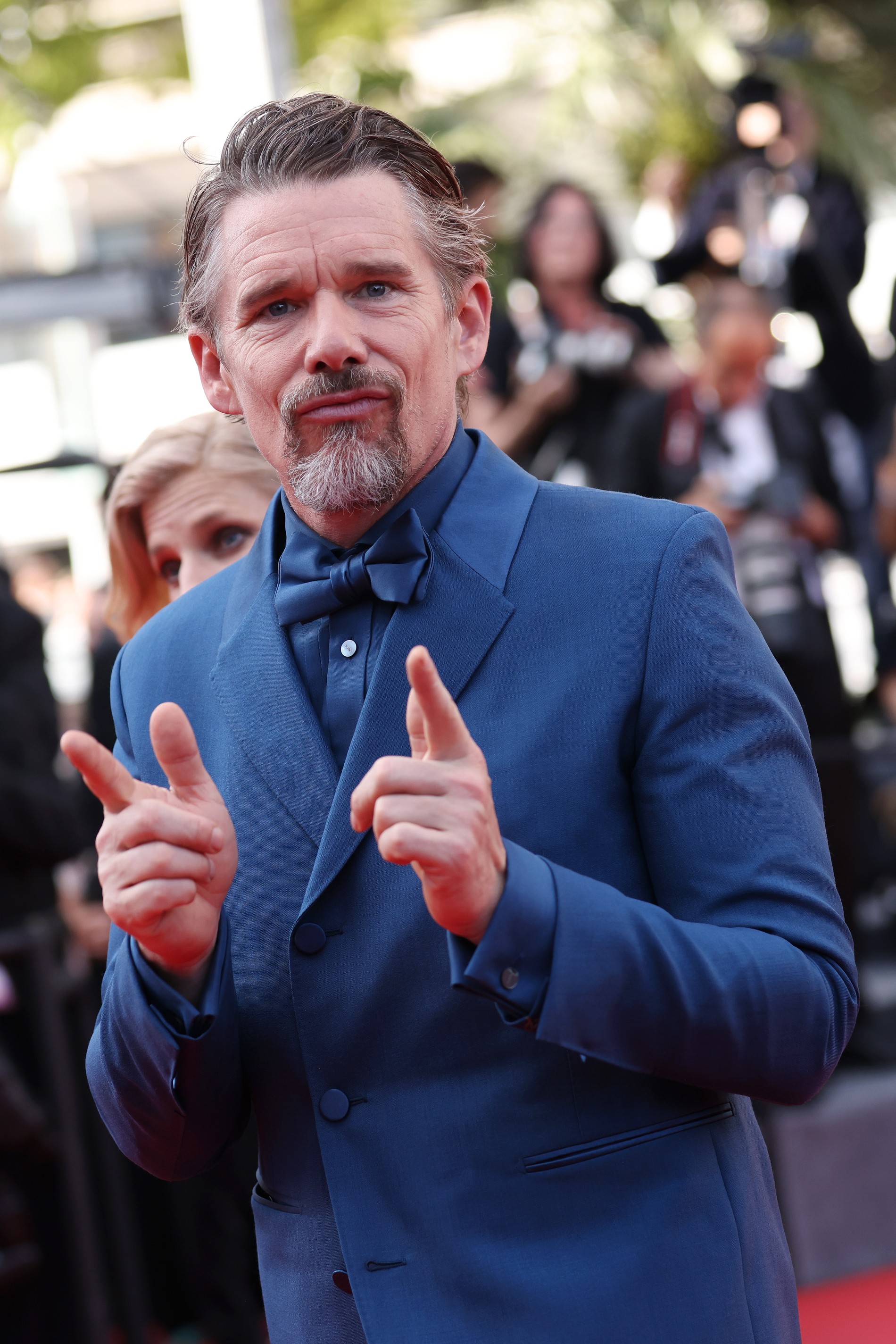 Итан Хоук, который редко появляется на публике вместе со своей женой, устроил настоящий подарок для фотографов: он весело позировал перед камерами, обнимая и целуя любимую. Актер появился в синем костюме, дополненном галстуком-бабочкой. Райан вышла в свет в черном кружевном платье.