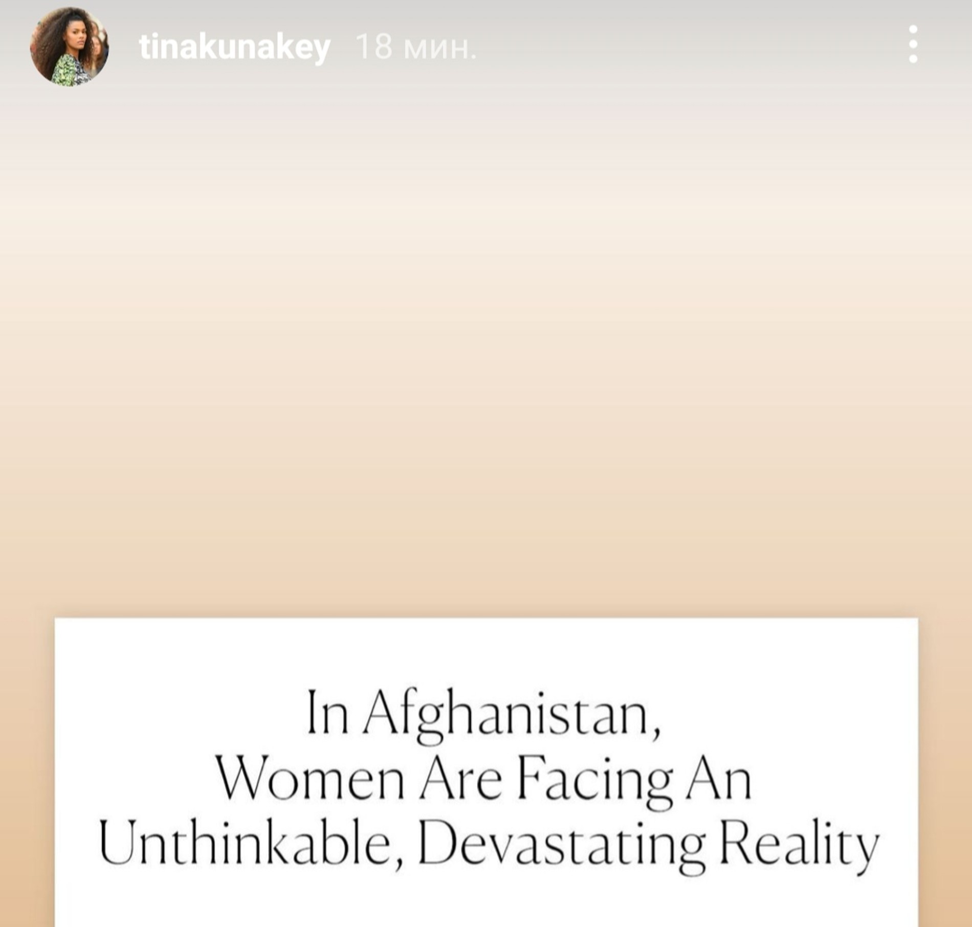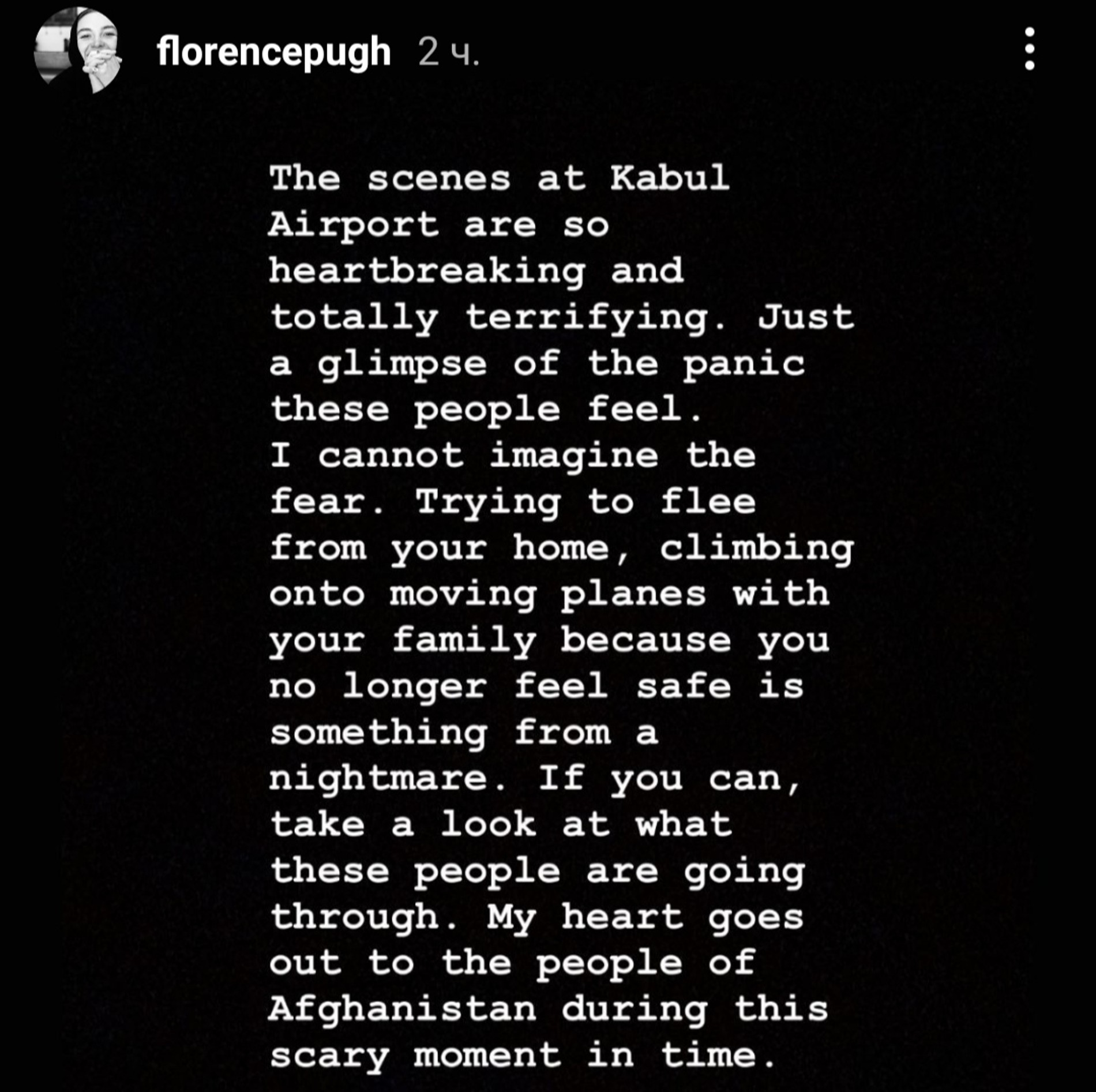 «События в аэропорту Кабула душераздирающие и ужасные. И это лишь часть той паники, которую ощущают люди. Представить себе не могу их страх. Пытаться сбежать из своего дома, забравшись на двигающийся самолет вместе с семьей, потому что вы больше не чувствуете безопасности, это кошмар. Если можете, посмотрите, через что проходят эти люди. Мое сердце в этот страшный момент с народом Афганистана»