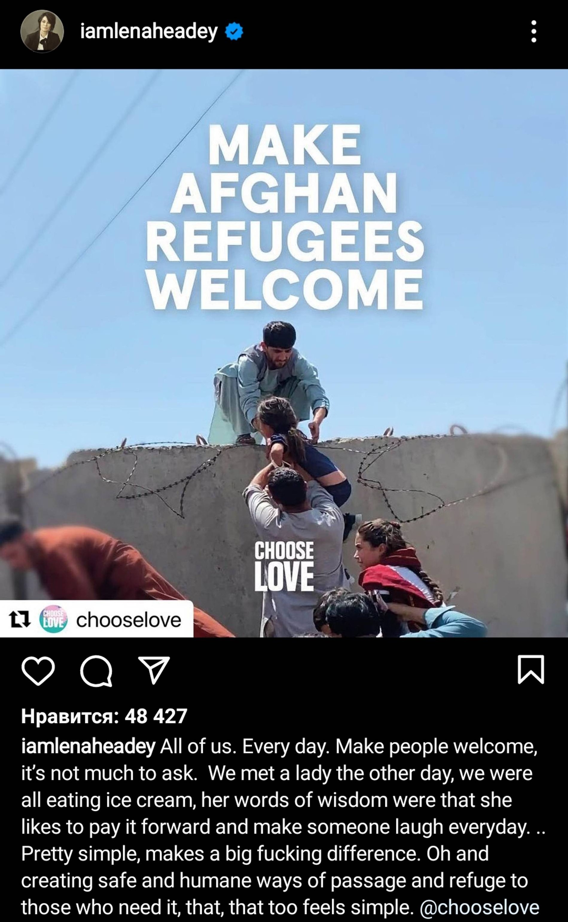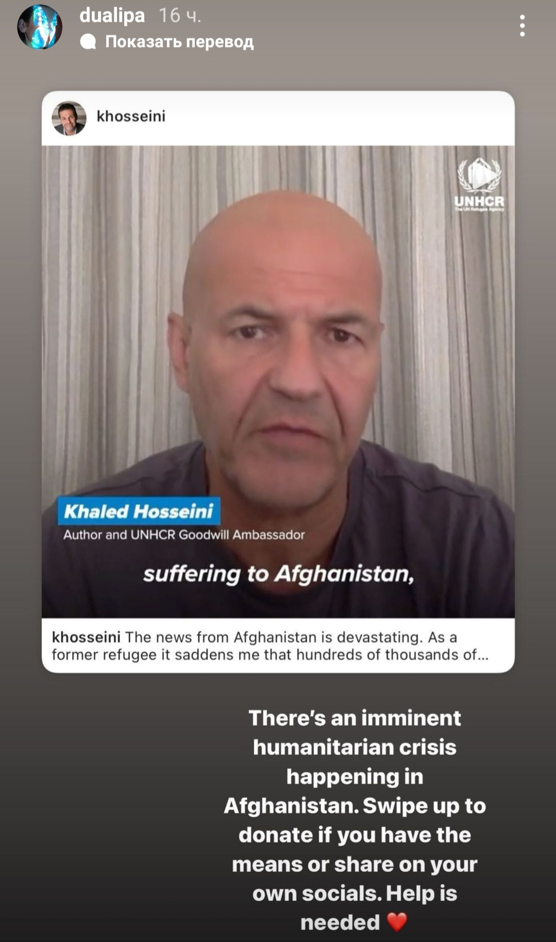 «В Афганистане сейчас разворачивается гуманитарный кризис. Переходите по ссылке, чтобы пожертвовать деньги, если можете, или поделитесь в своих соцсетях. Очень нужна помощь»