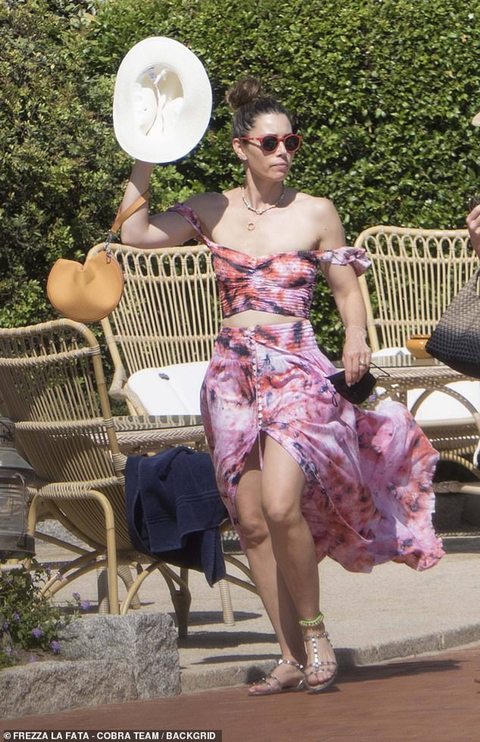 Идеальный пляжный образ Джессики Бил: кроп-топ и летящая юбка, цветом напоминающая о красочных закатах над южными морями.