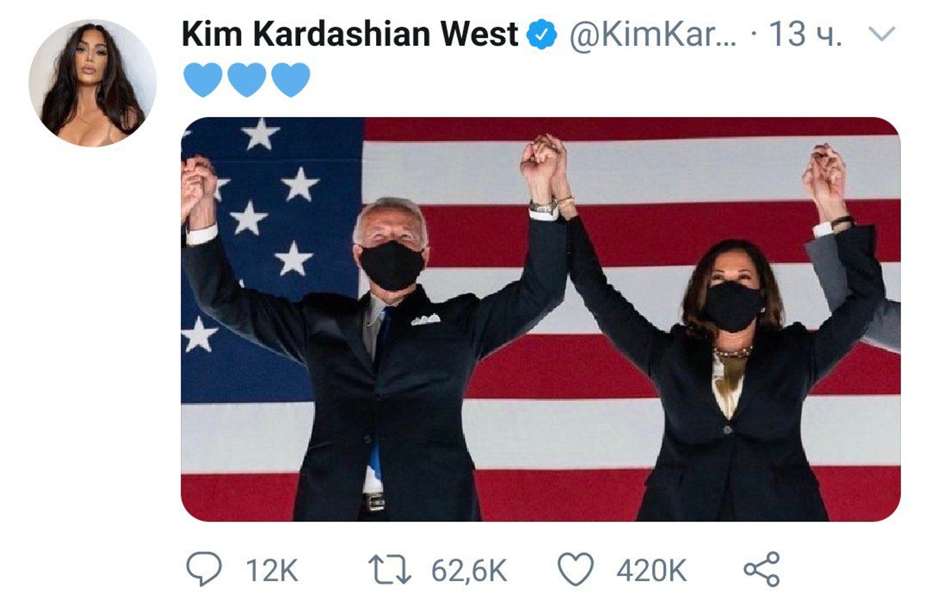 Ким Кардашьян, чей муж признал поражение на выборах президента, заявив, что будет баллотироваться в 2024-м, кажется, рада, что Канье все-таки не переезжает в Овальный кабинет. В своих соцсетях она поддержала Байдена и заодно первую женщину-вице-президента — Камалу Харрис.