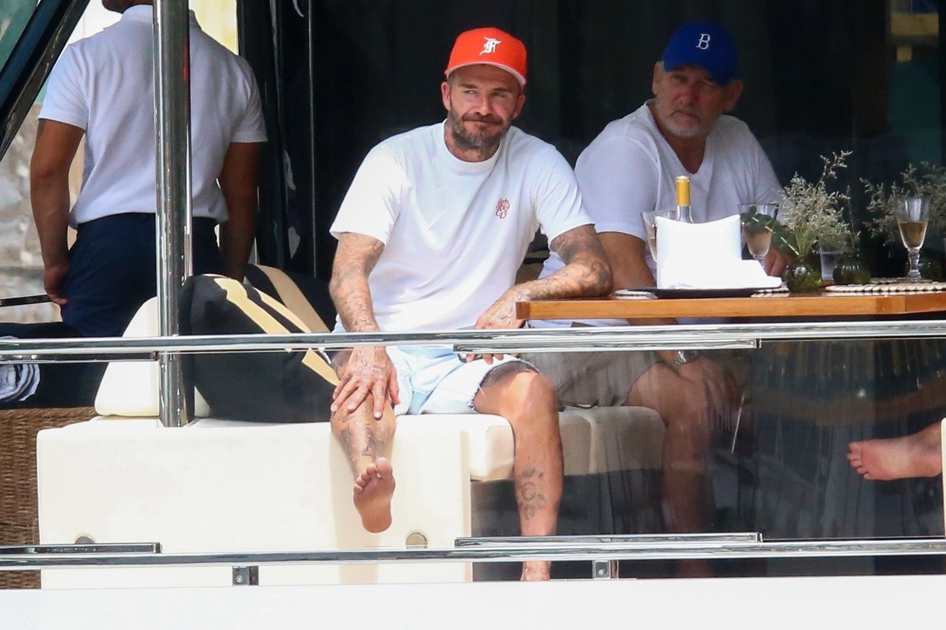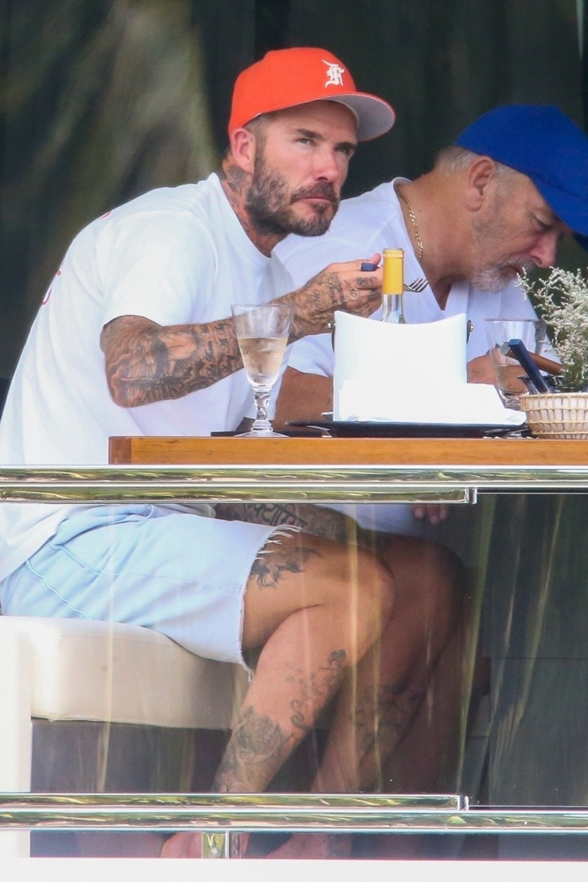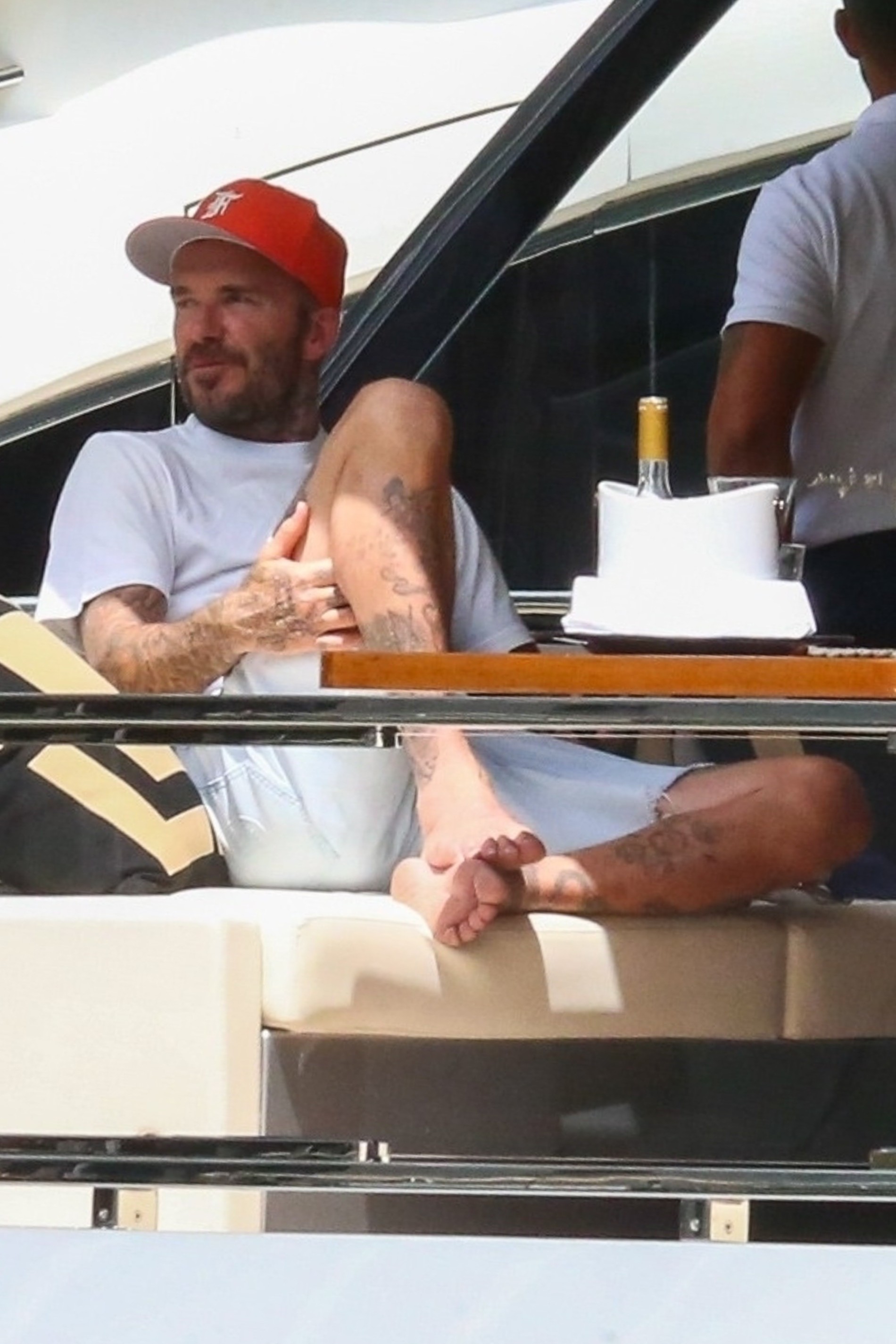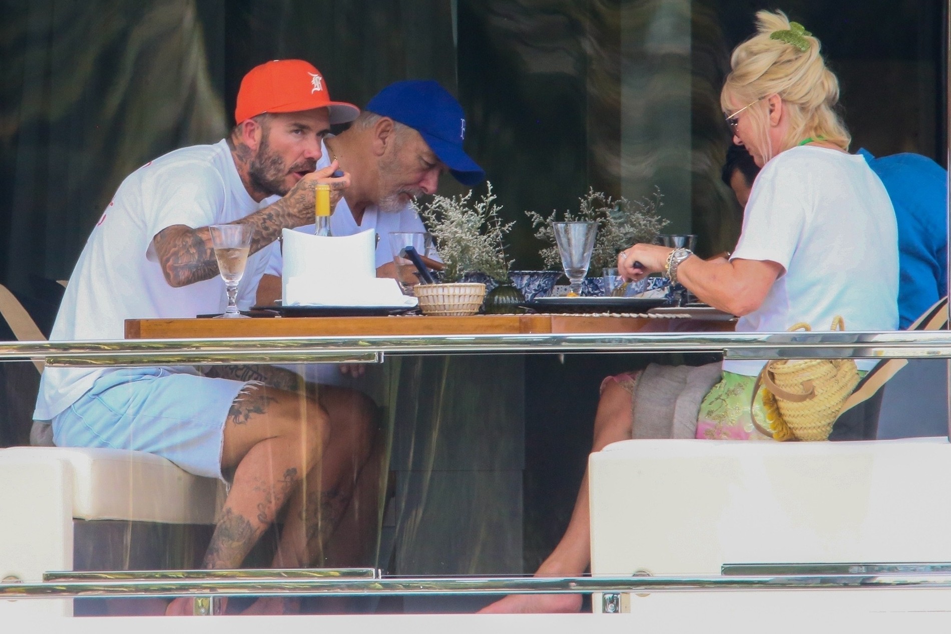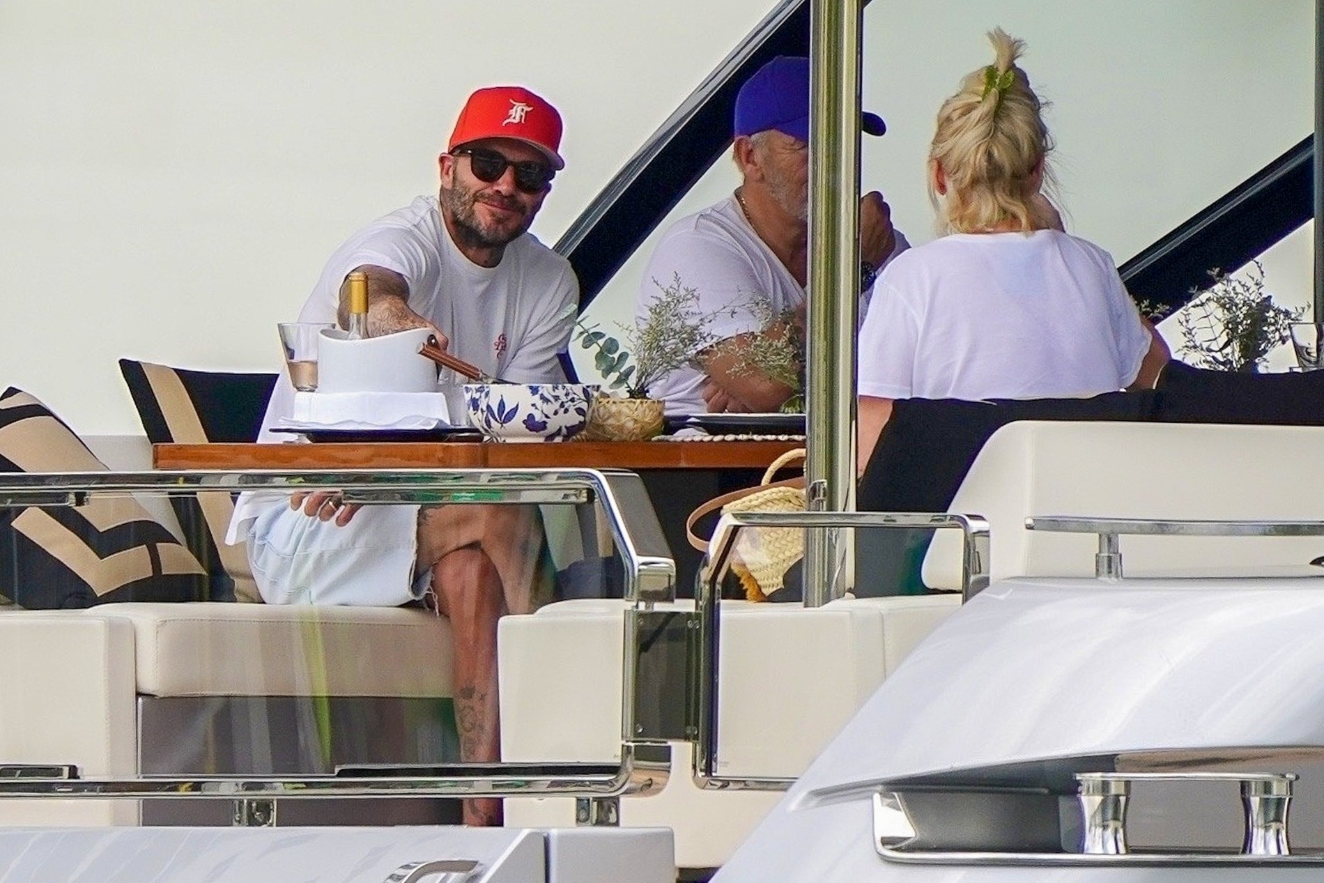 На следующий день папарацци застали звезду английского футбола за ланчем на яхте. Дэвид в ярко-оранжевой кепке наслаждался белым вином и солнечной погодой в компании друзей. Футболист не скрывался от фотографов и пару раз улыбнулся прямо в камеру.