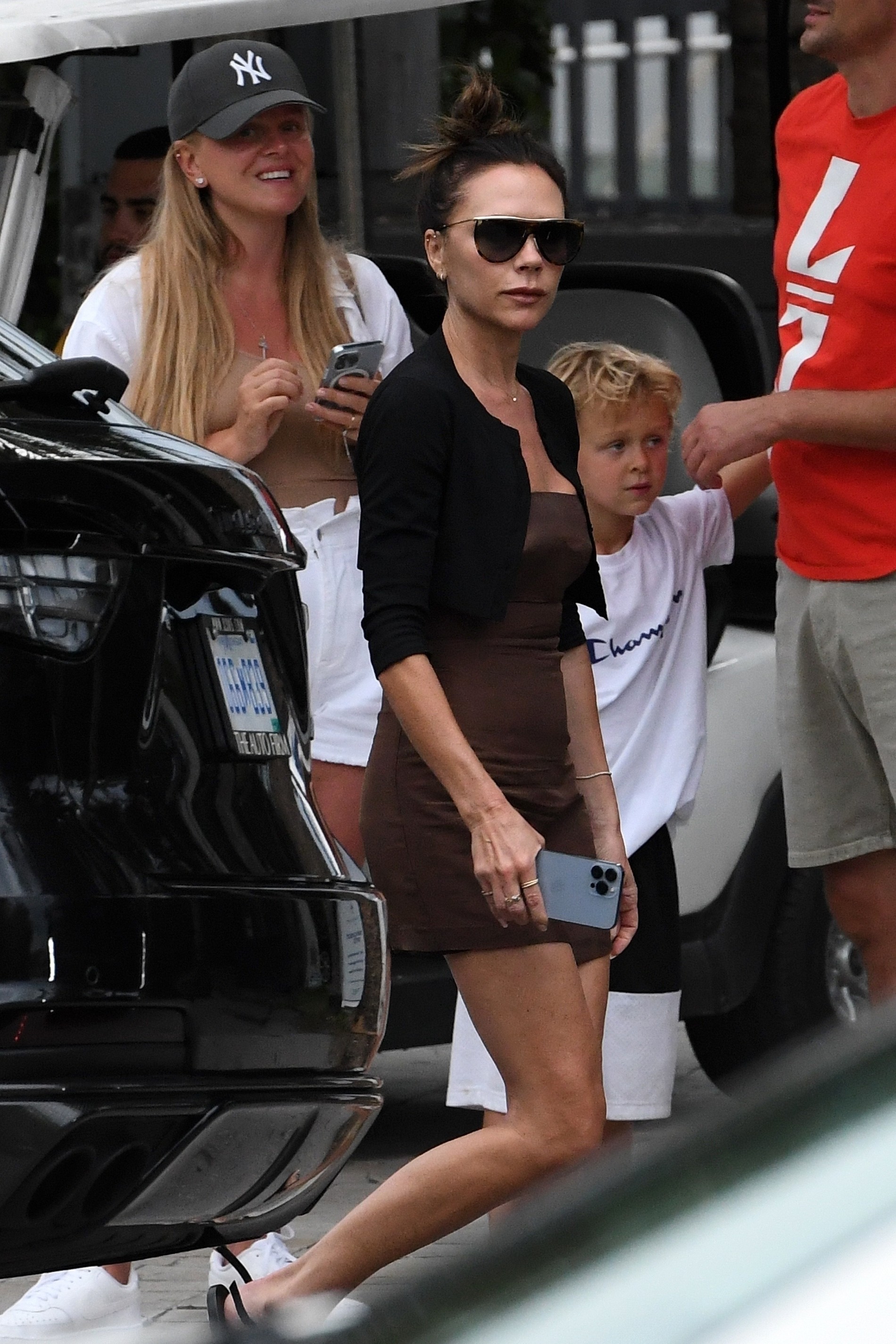 Папарацци засняли звездное семейство во время путешествия на яхте в Майами. Виктория выбрала мини-платье шоколадного оттенка и черные босоножки. Дэвид на яхте появился в футболке и шортах, но прихватил с собой костюм.