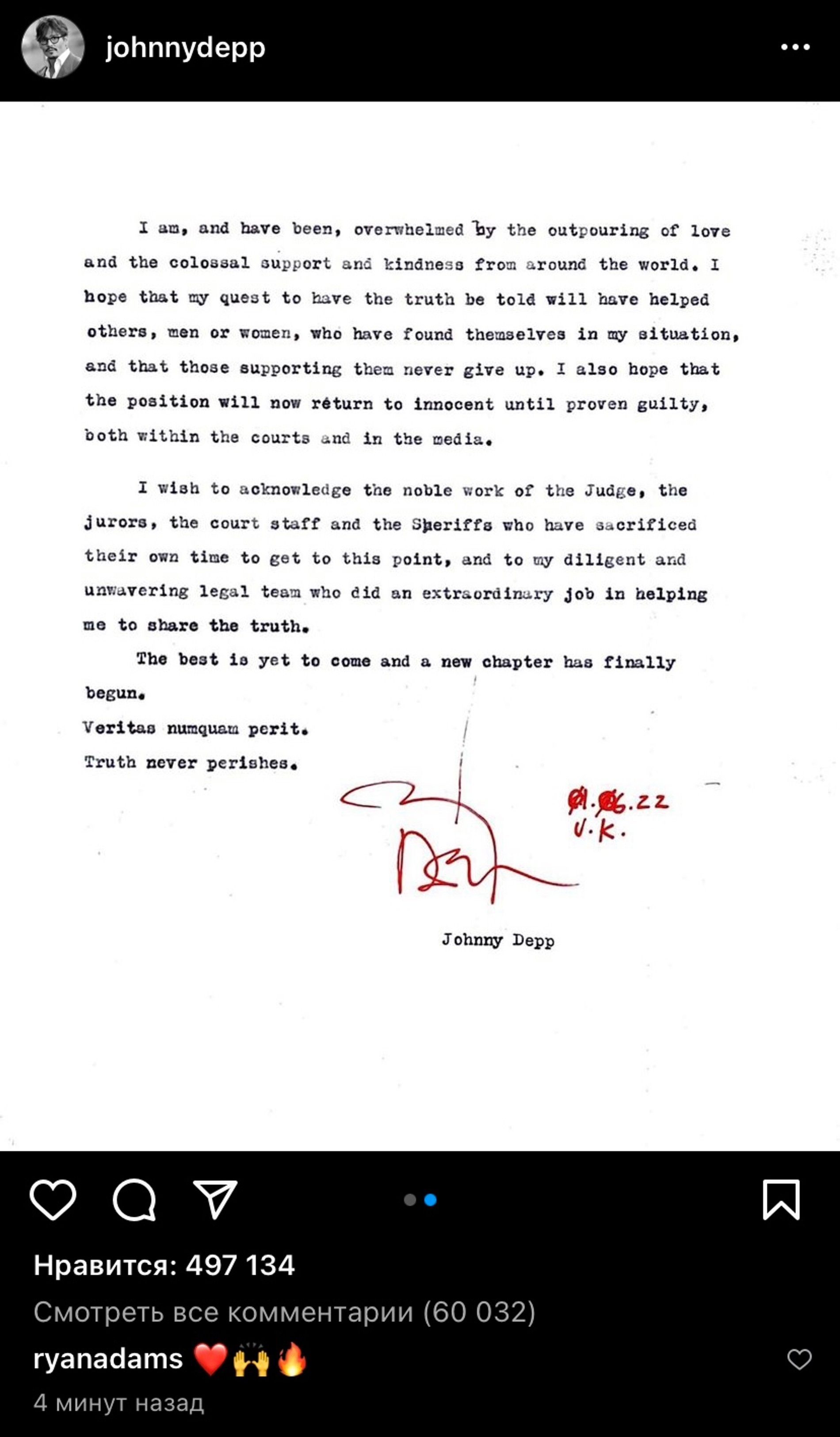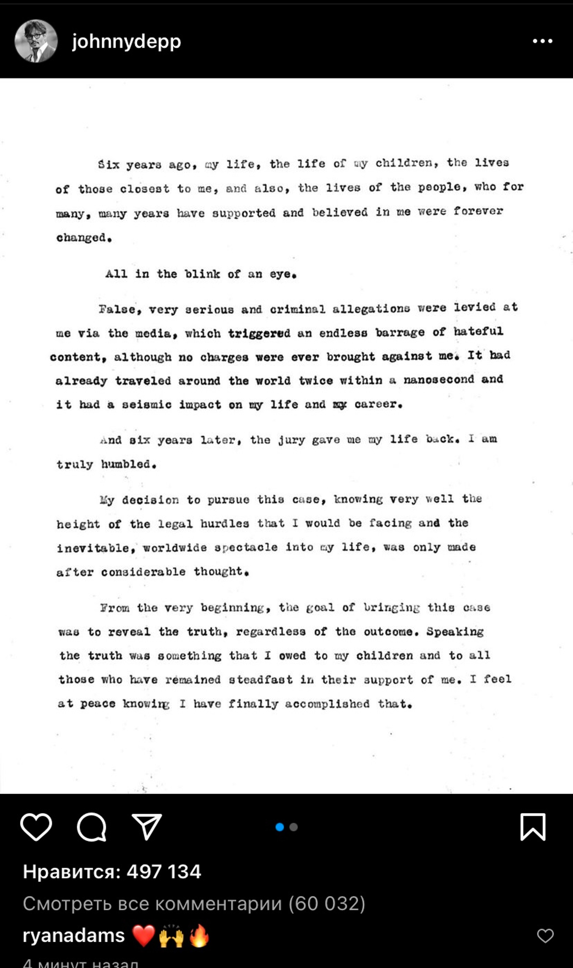 «Шесть лет назад моя жизнь, жизнь моих детей, тех, кто дорог мне, и тех, кто много-много лет поддерживал и верил в меня, навсегда изменилась. И все это в мгновение ока. Против меня были выдвинуты ложные, очень серьезные и преступные обвинения через средства массовой информации, что вызвало бесконечный шквал ненавистнического контента. Хотя против меня никогда не выдвигалось никаких обвинений. За наносекунду этот контент уже дважды облетел весь мир и оказал сейсмическое воздействие на мою жизнь и карьеру. Через шесть лет после этого присяжные вынесли мне приговор, который сильно по мне ударил. Я был унижен. Решение заняться этим делом, прекрасно понимая всю глубину юридических сложностей, с которыми я столкнусь, и неизбежность публичности, было принято только после долгих раздумий. С самого начала целью возбуждения этого дела было раскрыть правду, независимо от исхода. Говорить правду — вот чем я был обязан своим детям и всем, кто оставался непоколебимым в своей поддержке. Я чувствую умиротворение, понимая, что наконец-то добился справедливости. Я потрясен любовью, колоссальной поддержкой и добротой, которые получал от всего мира. Надеюсь, что мое стремление добиться того, чтобы говорить правду, помогло другим — мужчинам или женщинам, оказавшимся в моей ситуации. Также надеюсь, что те, кто поддерживает их, не будут сдаваться. Я надеюсь, что отныне в судах и в средствах массовой информации не будет «виновных», пока вина не будет доказана. Я хочу выразить признательность судье, присяжным заседателям, сотрудникам суда и шерифам, которые пожертвовали своим временем, чтобы дойти до этого финала. Также благодарю мою непоколебимую юридическую команду, которая проделала выдающуюся кропотливую работу, помогая мне говорить правду. Лучшее еще впереди, и, наконец, началась новая глава. Veritas numquam perit. Правда всегда побеждает. Джонни Депп»