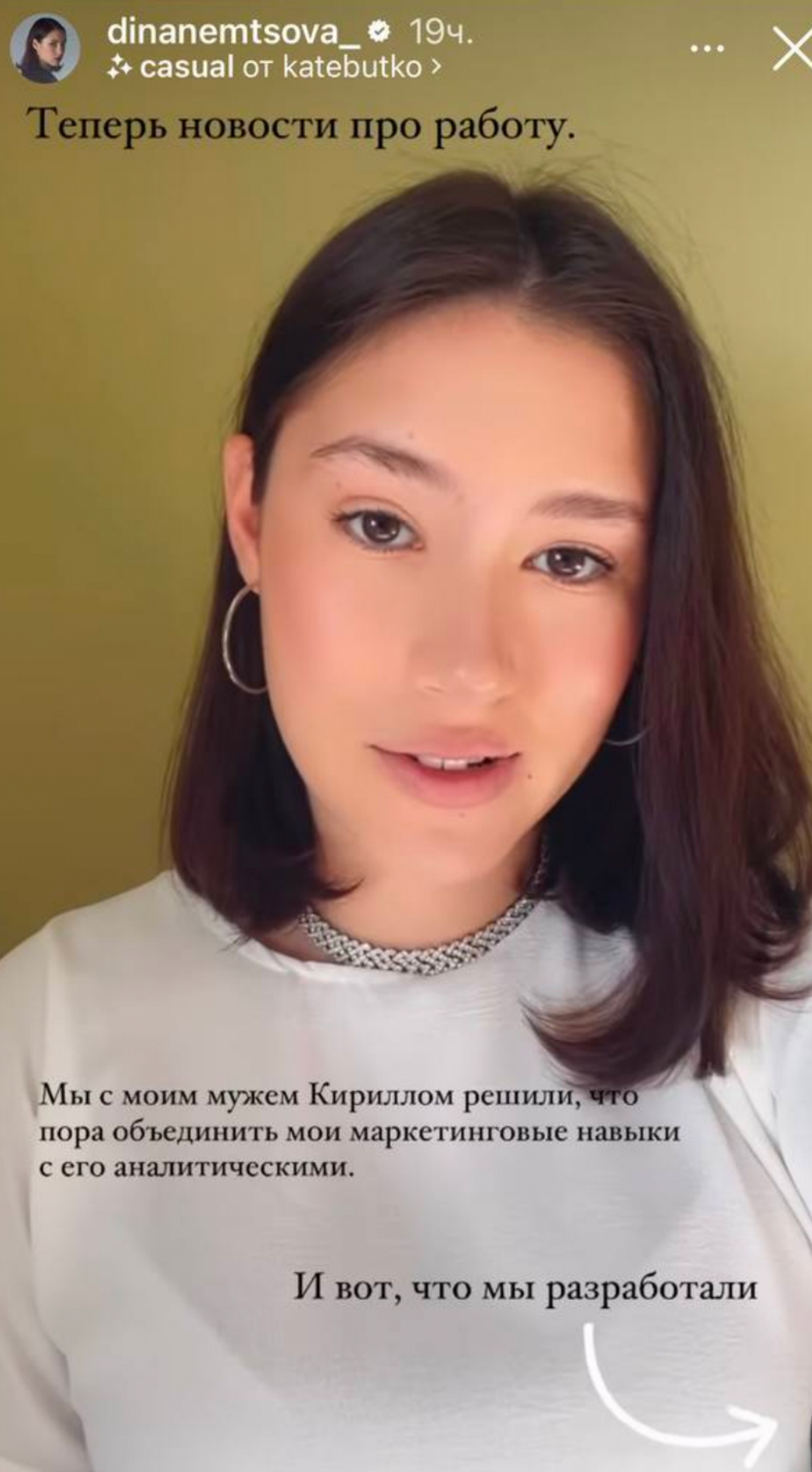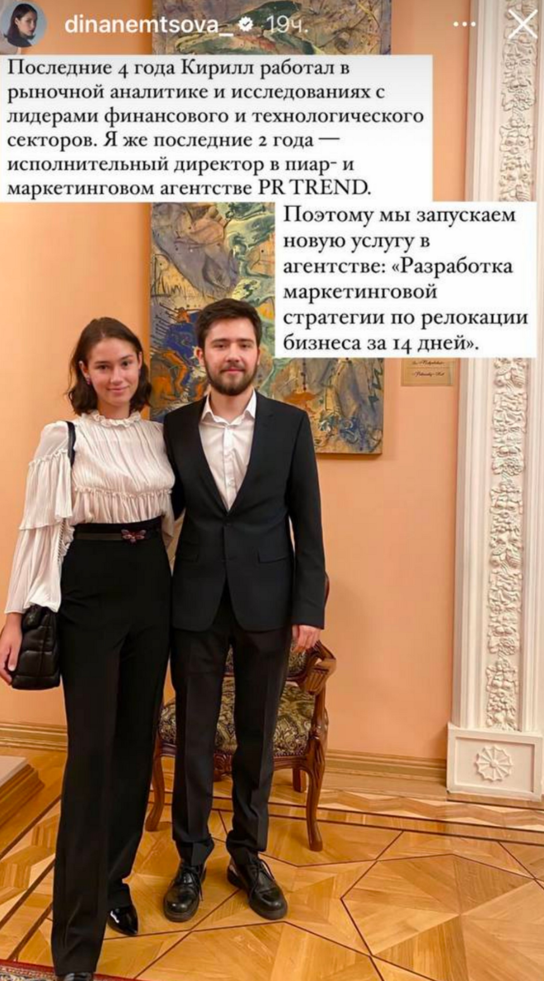 «Последние четыре года мой муж Кирилл работал в рыночной аналитике и исследованиях с лидерами финансового и технологического секторов. Я последние два года — исполнительным директором в агентстве PR TREND. Мы решили, что пора объединить наши маркетинговые и аналитические навыки, поэтому запускаем услугу "Разработка маркетинговой стратегии по релокации бизнеса за 14 дней"», — написала девушка.