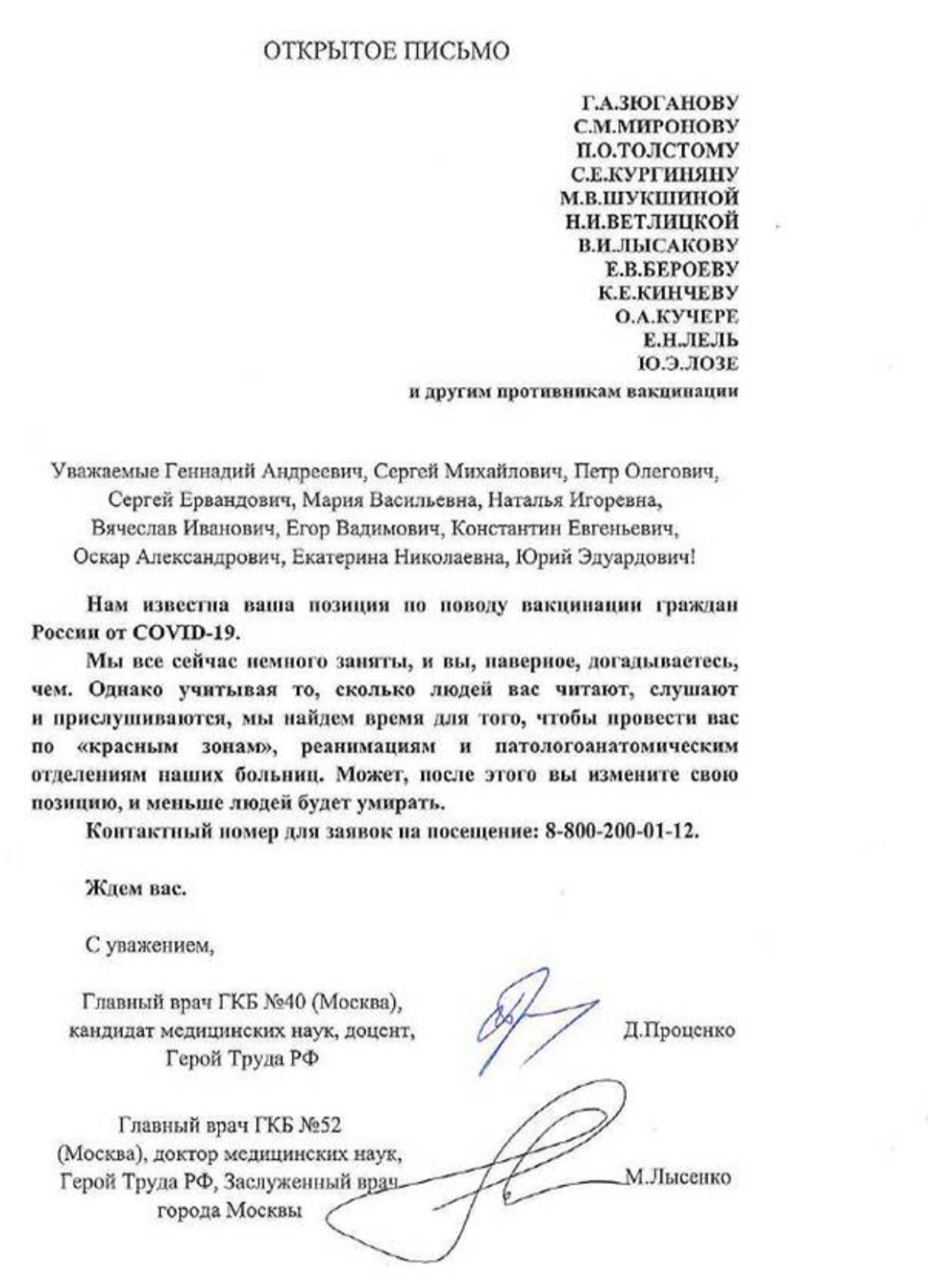 Главврачи российских больниц решили публично обратиться к популярным людям, которые пропагандируют отказ от вакцинации. В качестве адресатов в открытом письме были упомянуты актеры Мария Шукшина и Егор Бероев, певица Наталья Ветлицкая, Катя Лель, Юрий Лоза, Оскар Кучера, рокер Константин Кинчев, а также лидеры КПРФ и «Справедливой России» Геннадий Зюганов и Сергей Миронов. Медики предложили активаксерам лично посетить красную зону и прогуляться по реанимации, после этого, как отмечают врачи, селебрити изменят свое мнение.