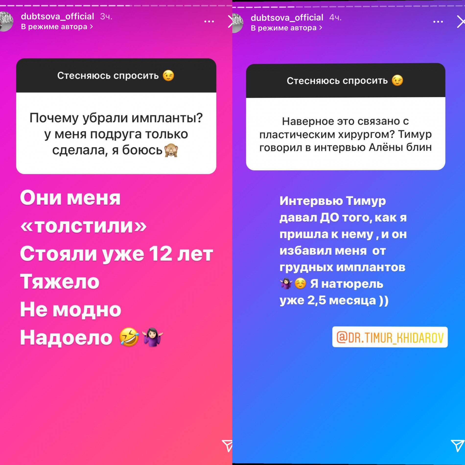 Певица Ирина Дубцова решила уменьшить грудь и удалить грудные импланты. По словам артистки, операцию по увеличению она сделала 12 лет назад, с тех пор большая грудь ей надоела, кроме того, пышные формы вышли из моды. «Я натюрель!» — написала Ирина в своем Инстаграме. Как отметила Дубцова, импланты ее «толстили», а операцию провел хирург Тимур Хайдаров.