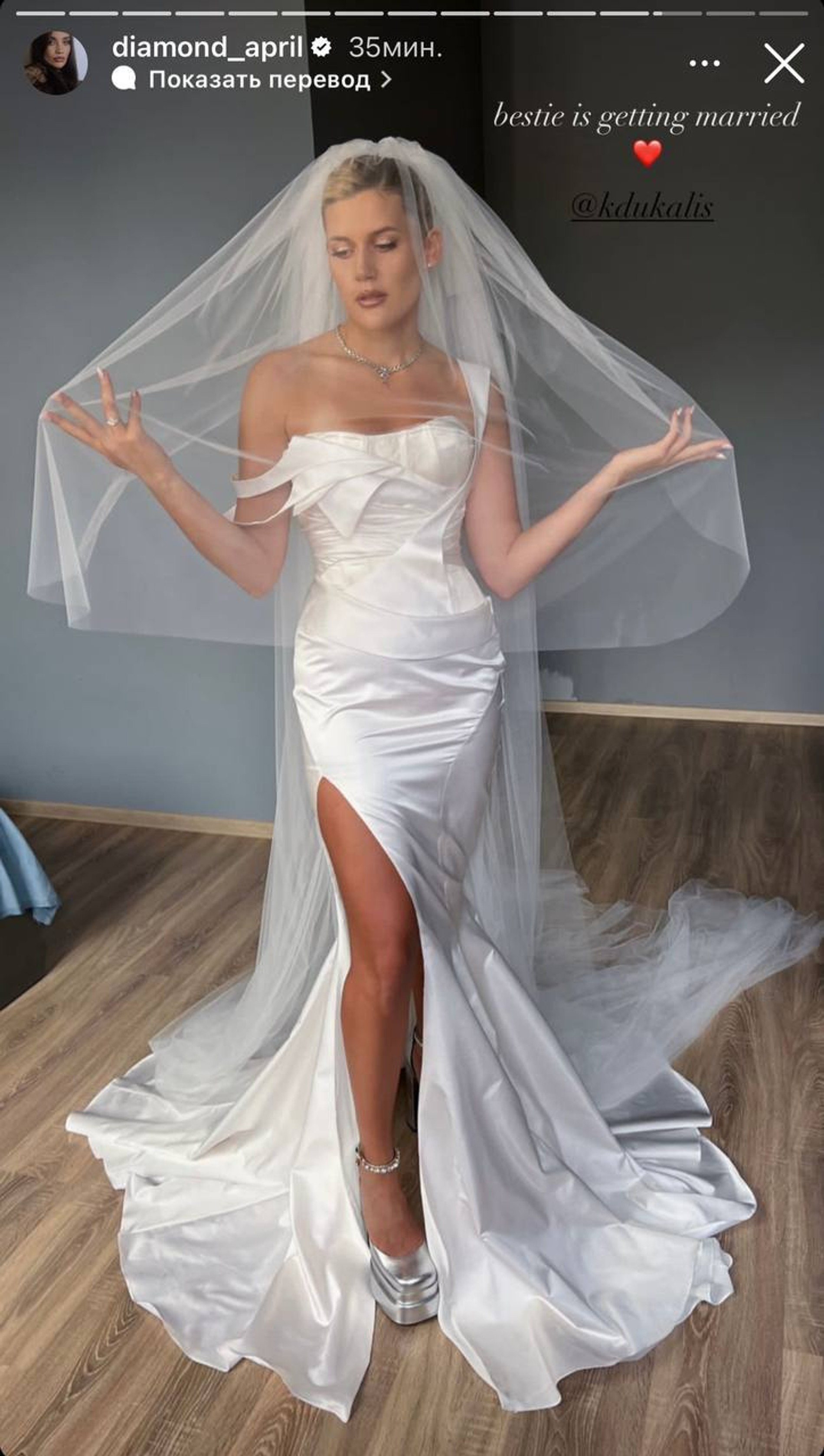 А пока пара обменивалась кольцами и произносила клятвы, в инстаграм (запрещен в РФ) попали первые кадры свадебного образа невесты. Над нарядом работал российский дизайнер Олег Горчалин. От классического платья остались только белый цвет и фата — традиции Дукалис все же решила соблюсти.