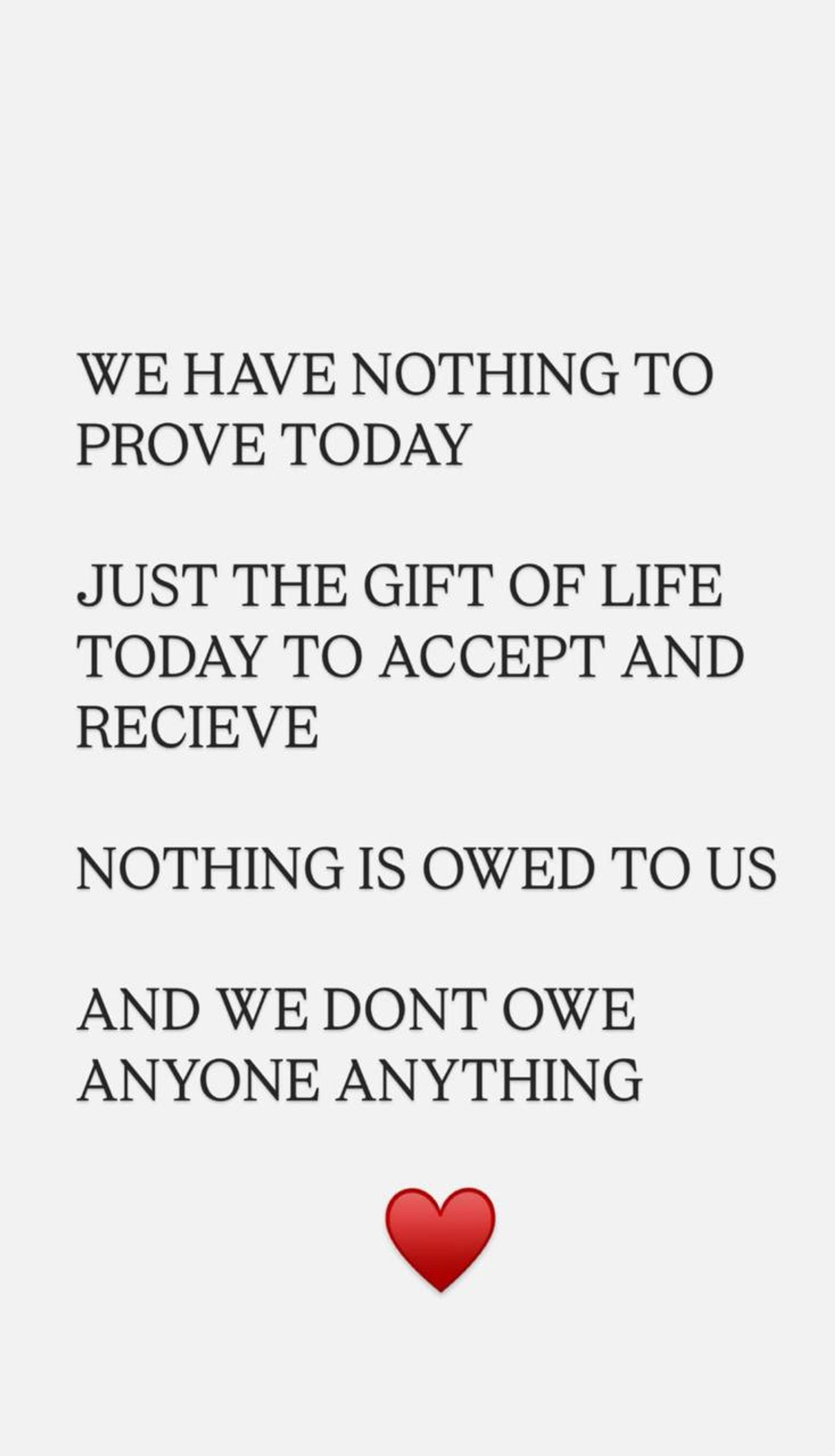 Наконец высказаться решил и сам Бибер. Правда, певец был немногословен и послал сообщение поклонникам с помощью очередной цитаты — то ли из песни, то ли из проповеди. «Сегодня нам нечего доказывать. Нужно просто получить и принять этот дар жизни. Нам никто ничего не должен, и мы никому ничего не должны», — написал молодой отец.
