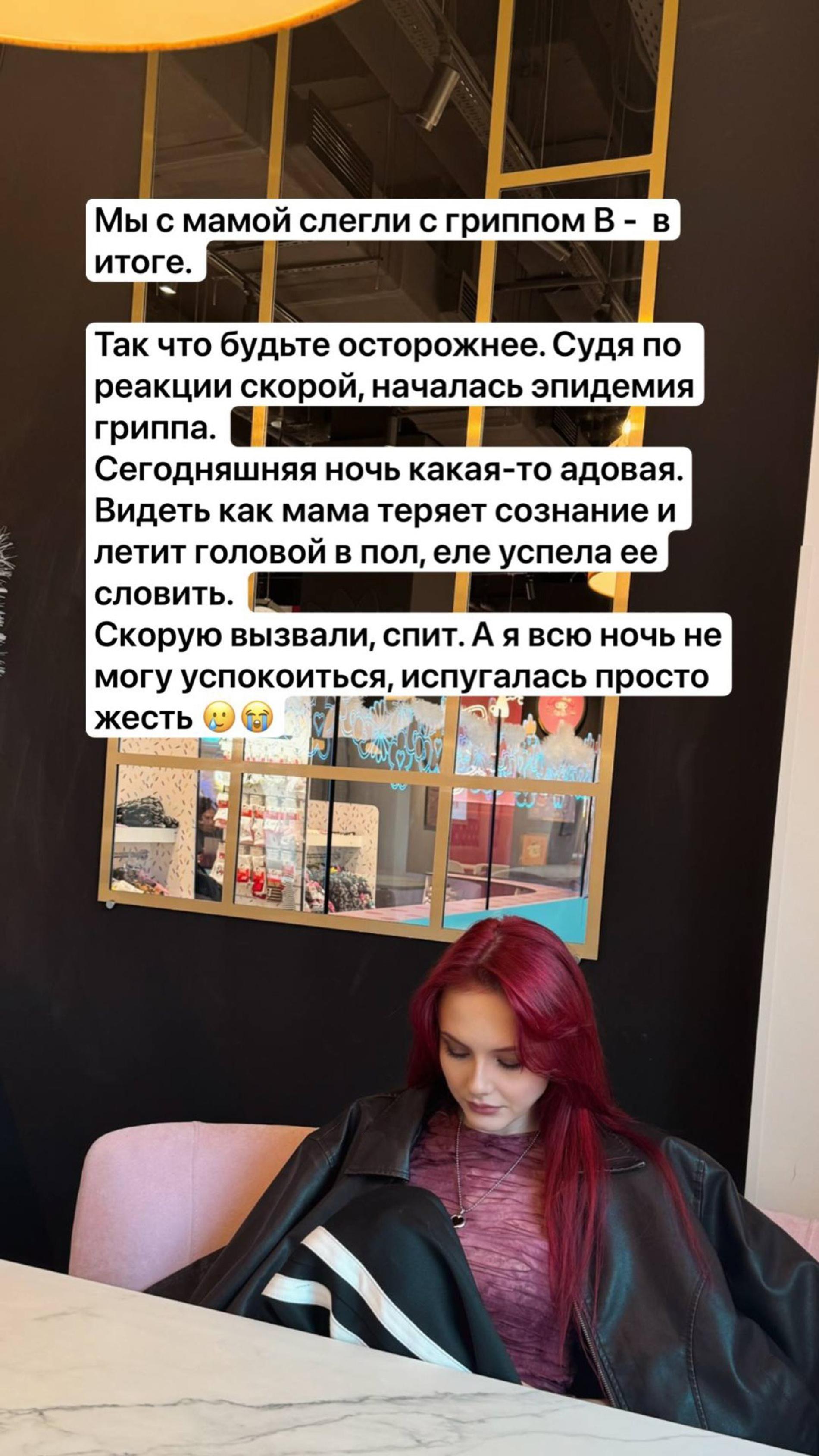 Сегодня экс-участница «Ранеток» Нюта напугала подписчиков тревожными новостями в сторис: певица рассказала, что вместе с мамой заболела гриппом B. «Сегодняшняя ночь какая-то адовая. Видеть, как мама теряет сознание и летит головой в пол, еле успела ее словить. Скорую вызвали, спит. А я всю ночь не могу успокоиться, испугалась просто жесть», — поделилась жуткой историей артистка.