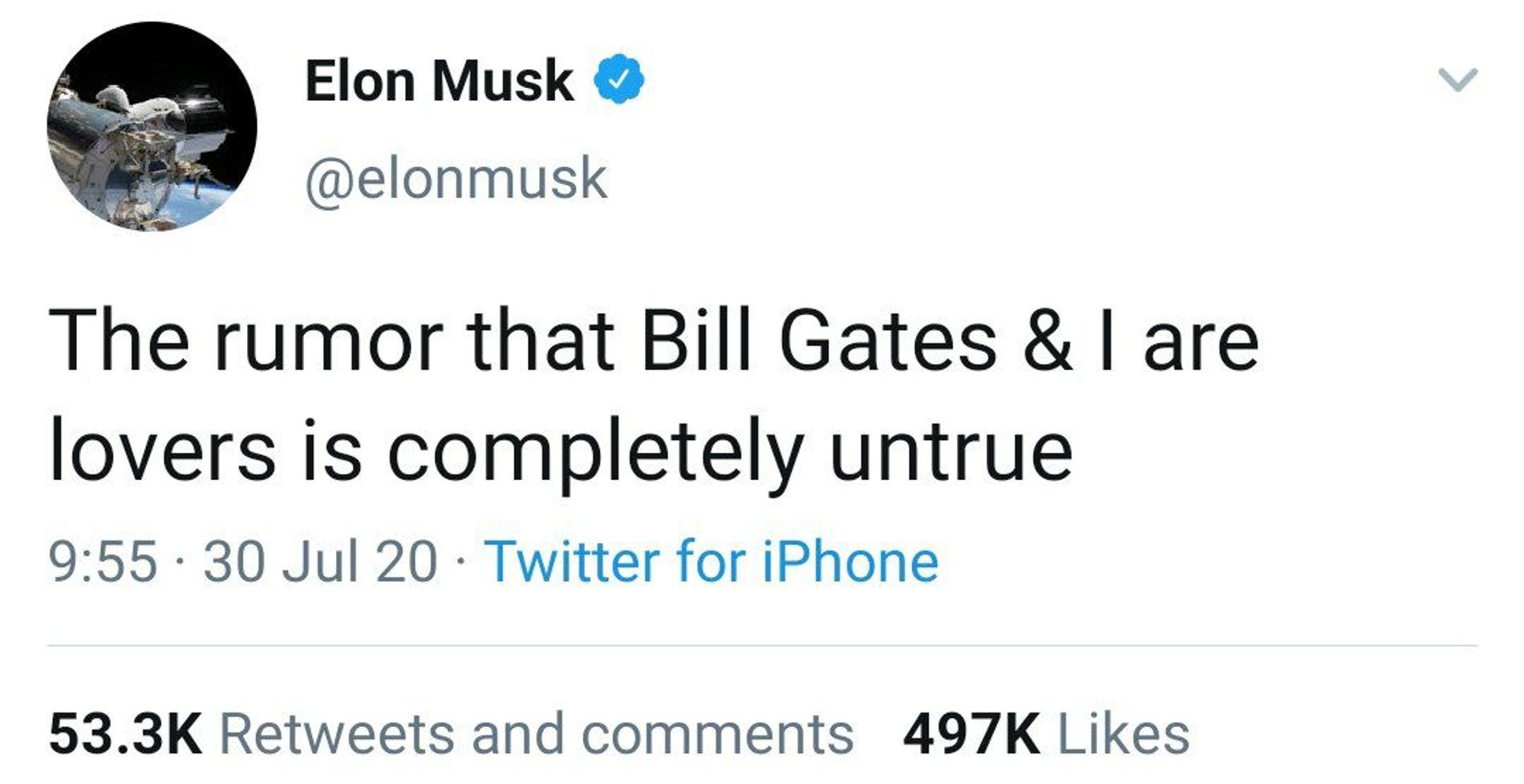 Экстравагантный миллиардер и покоритель космоса Илон Маск внезапно решил оповестить своих подписчиков о том, что у него нет романа с Биллом Гейтсом, написав, что слухи об этом — ложь. Таких слухов вообще-то и не было, хотя из-за специфического юмора Илона теперь они наверняка возникнут.