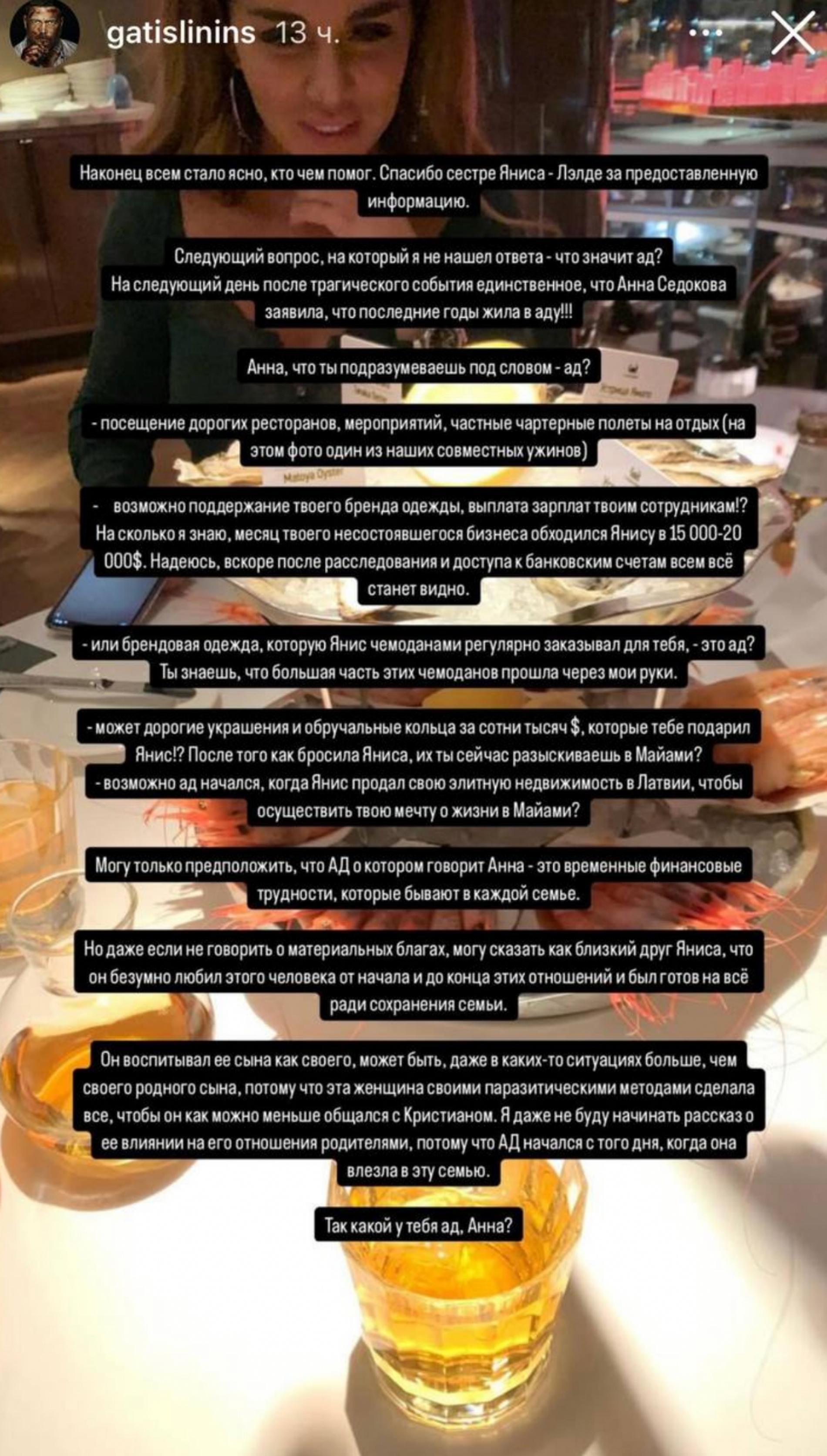 Еще один друг покойного Яниса Тиммы решил публично задать провокационные вопросы его бывшей жене Анне Седоковой. «Так какой у тебя ад, Анна? Что ты подразумеваешь под словом "ад"?» — обратился к певице в запрещенной сети Гатис Лининыш, припомнив ее первые слова в Инстаграме* после смерти Яниса. Также друг баскетболиста озвучил несколько фактов из жизни экс-супругов.