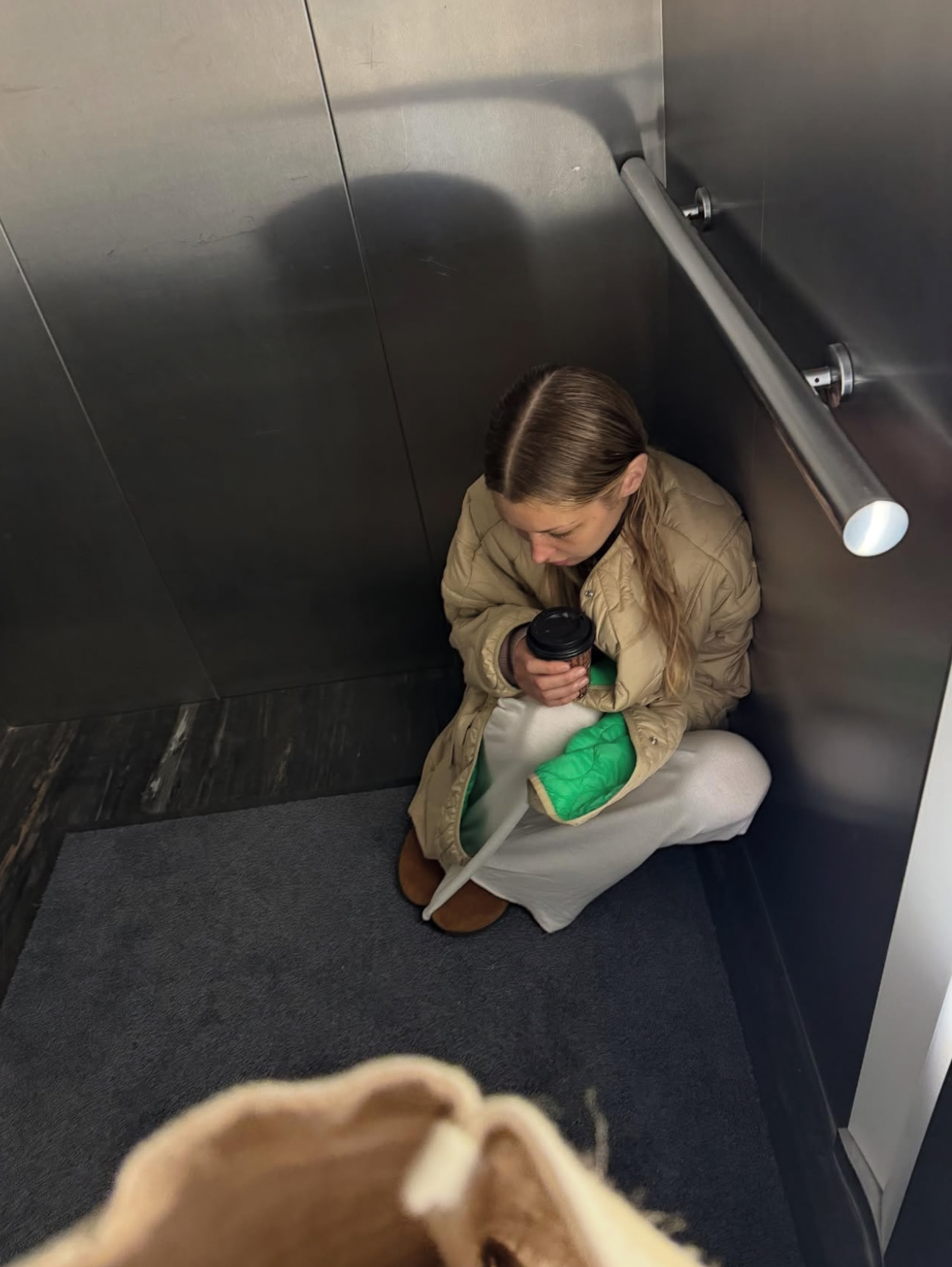 На одном из фото запечатлён момент, когда модель, по всей видимости, потеряла силы и осела на пол в больничном лифте.