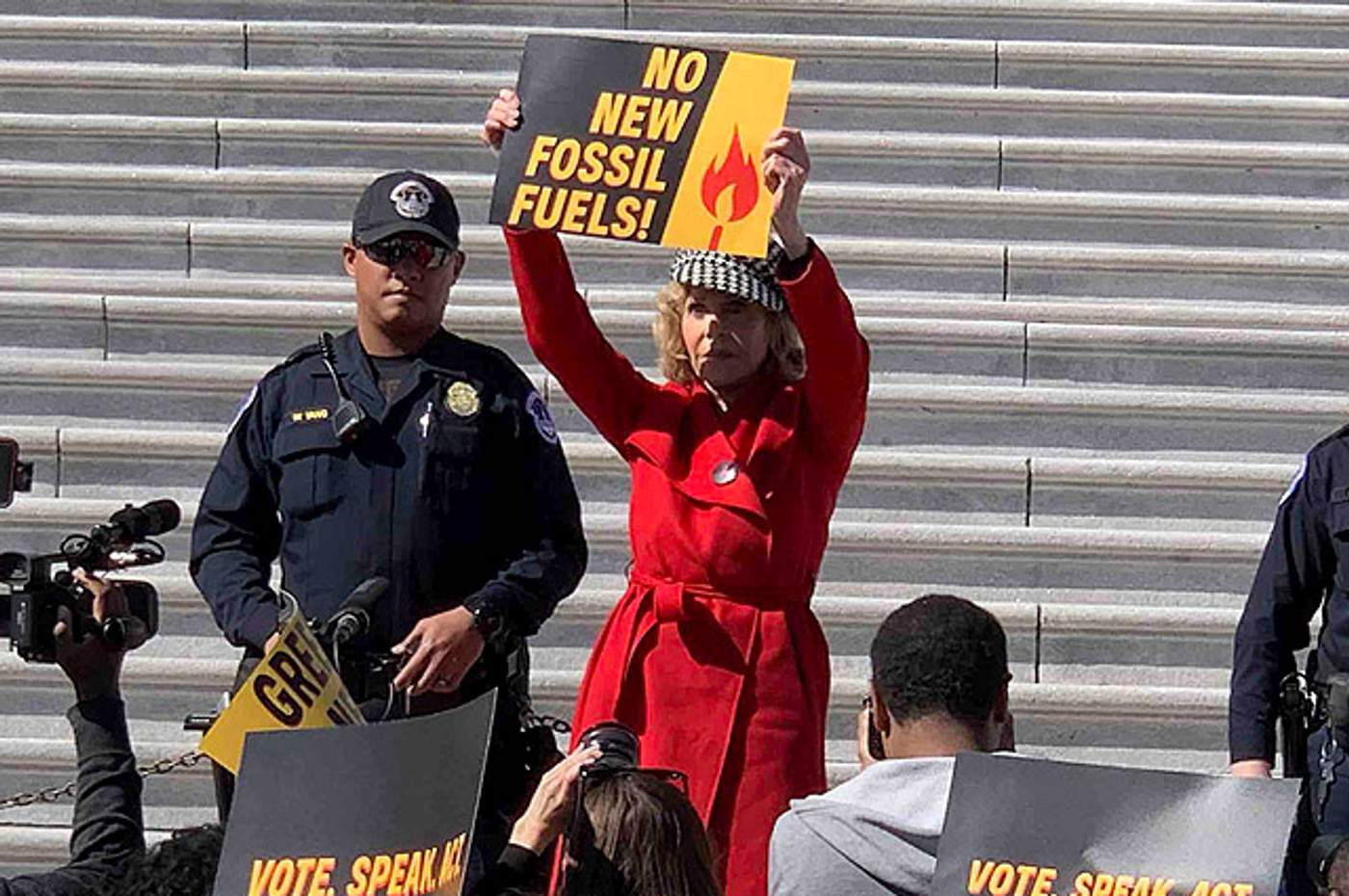 Оскароносная актриса Джейн Фонда была арестована в Вашингтоне за акцию протеста у здания Капитолия. 81-летняя знаменитость и ещё 15 её сторонников вышли к зданию Конгресса США, чтобы убедить сенаторов запретить добычу ископаемого топлива. Актрису и её единомышленников арестовали за нарушение закона, запрещающего блокировать входы в общественные здания. Джейн Фонду в наручниках доставили в полицейский участок, но вскоре отпустили. Теперь ей грозит штраф или 90 дней тюремного заключения.